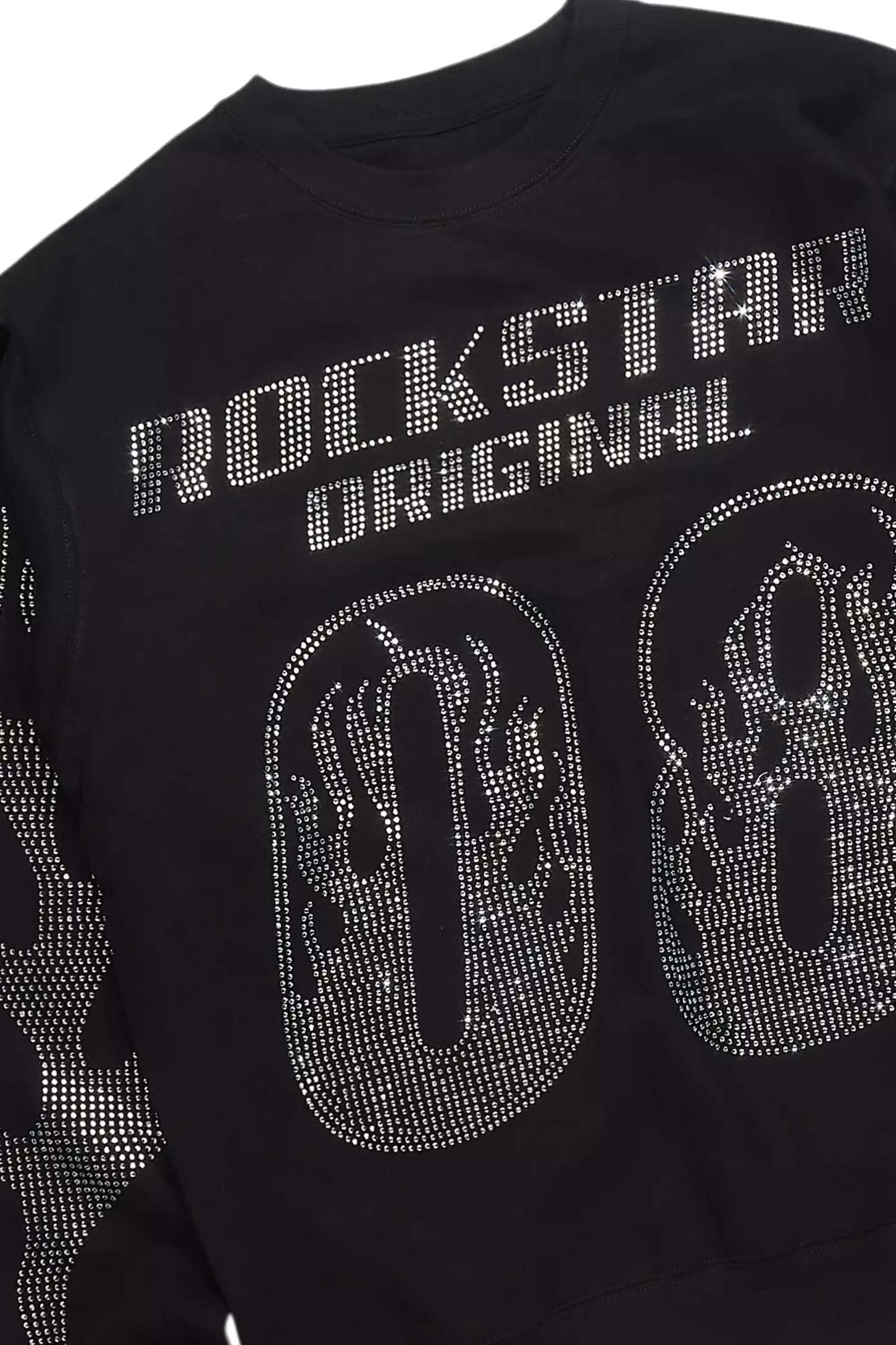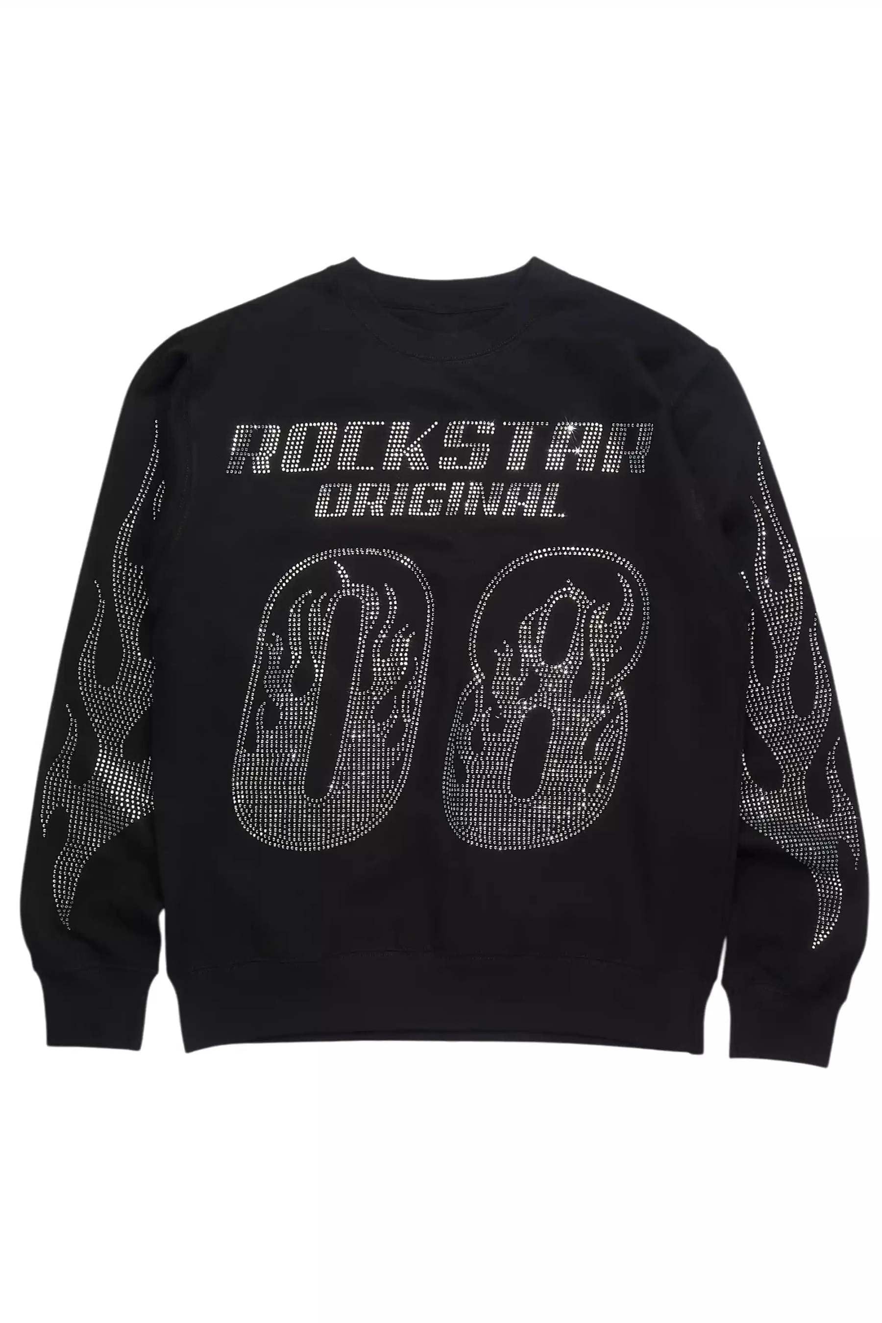 An urban streetwear crewneck sweatshirt for men in black. Designed with organic cotton and custom rhinestone detailing for a dope everyday style.