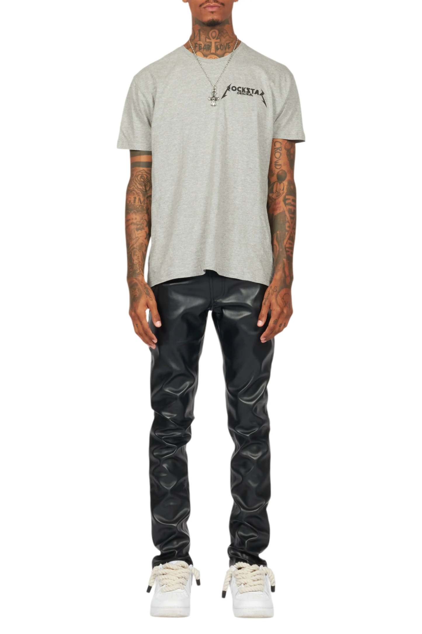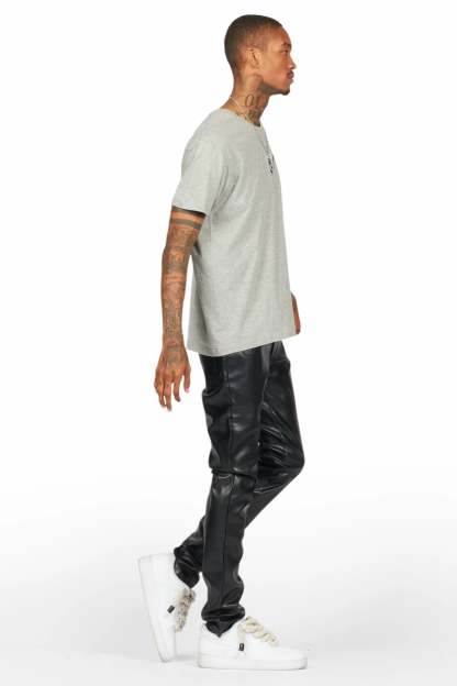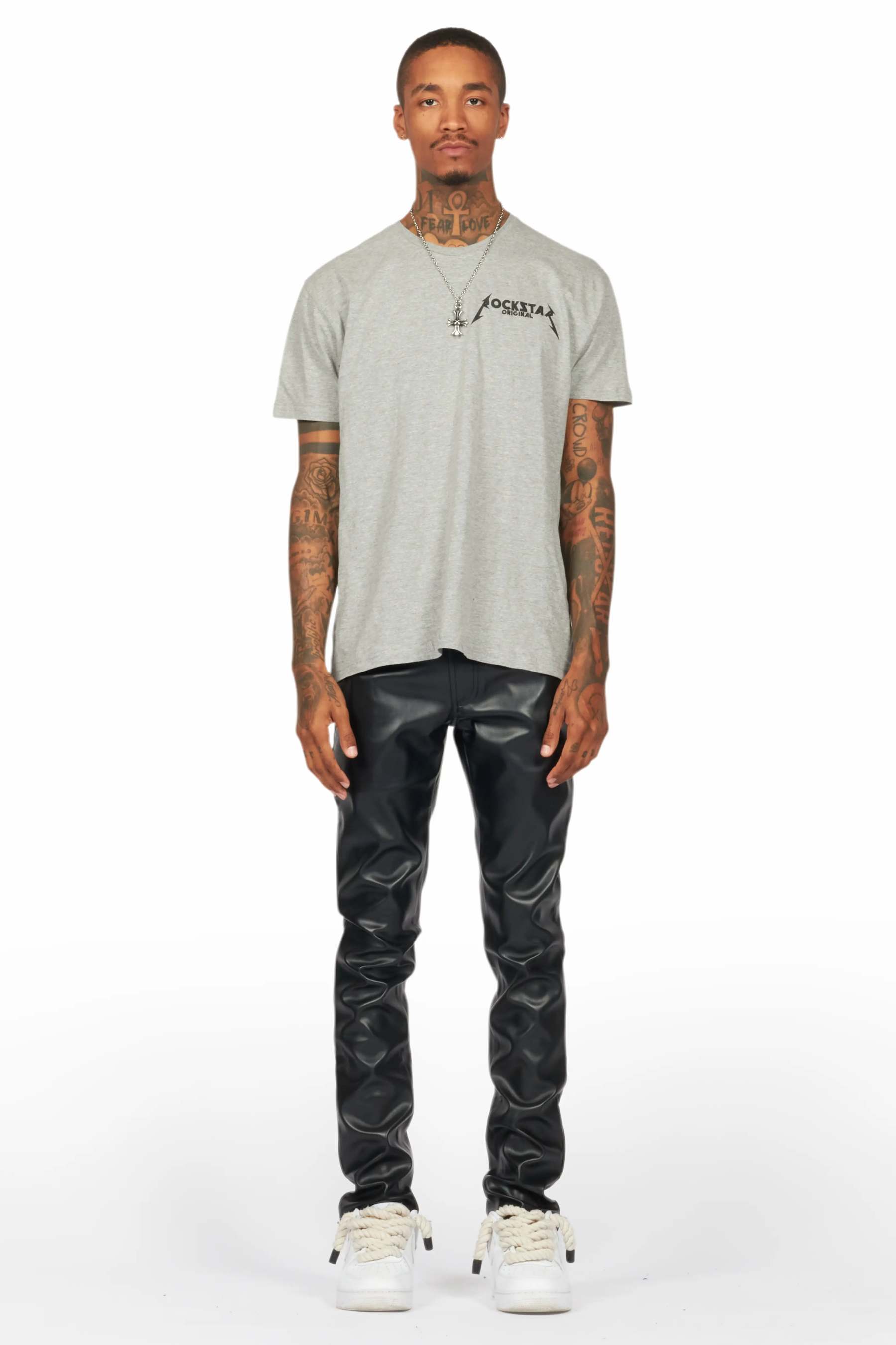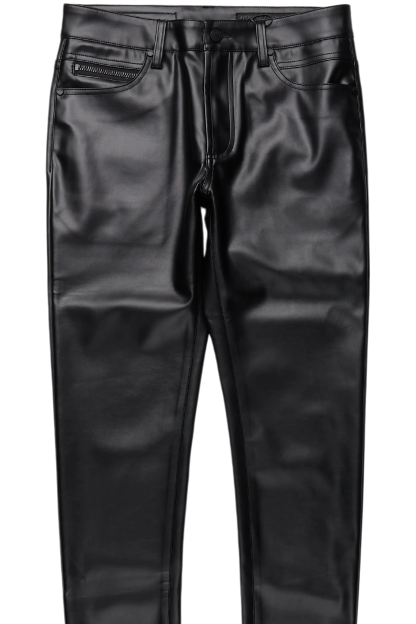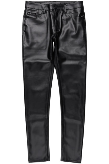 An urban skinny jean for men black. Designed with faux leather fabric for a dope denim streetwear style.