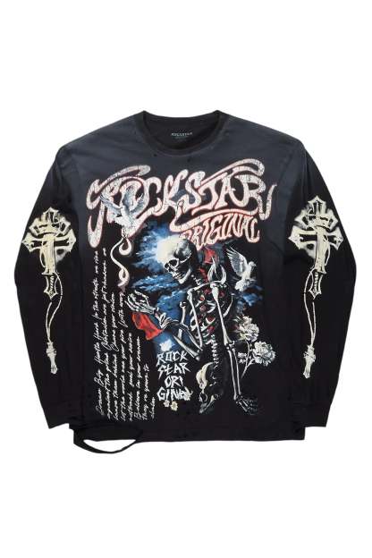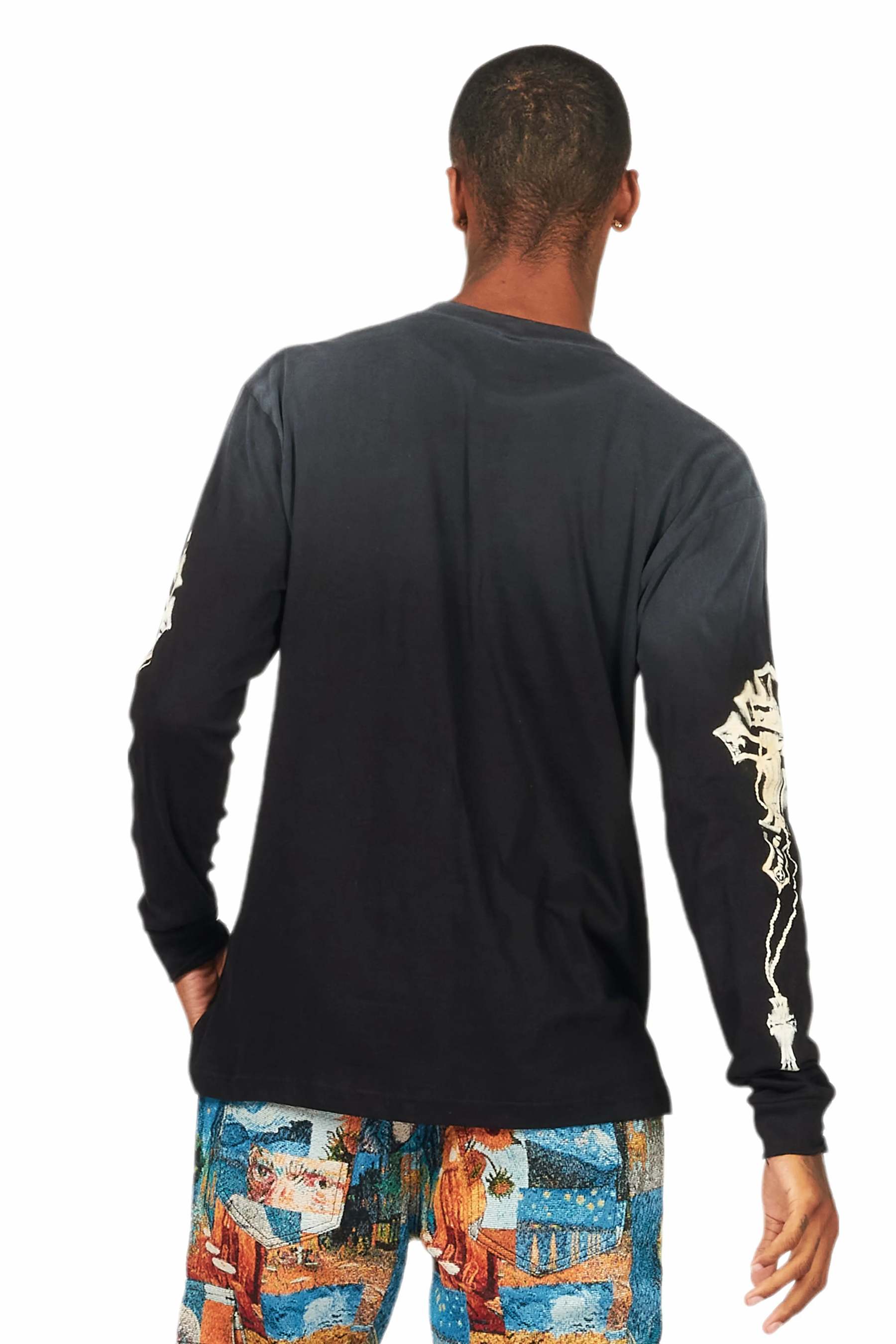 An urban streetwear long sleeve tee for men in black. Designed with a worn-in wash and custom detailing for a must-cop staple piece tee.