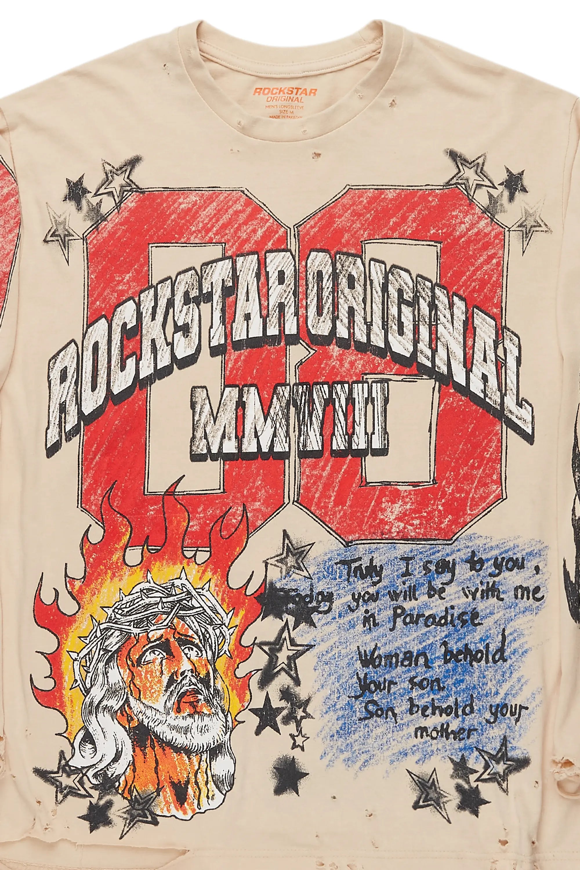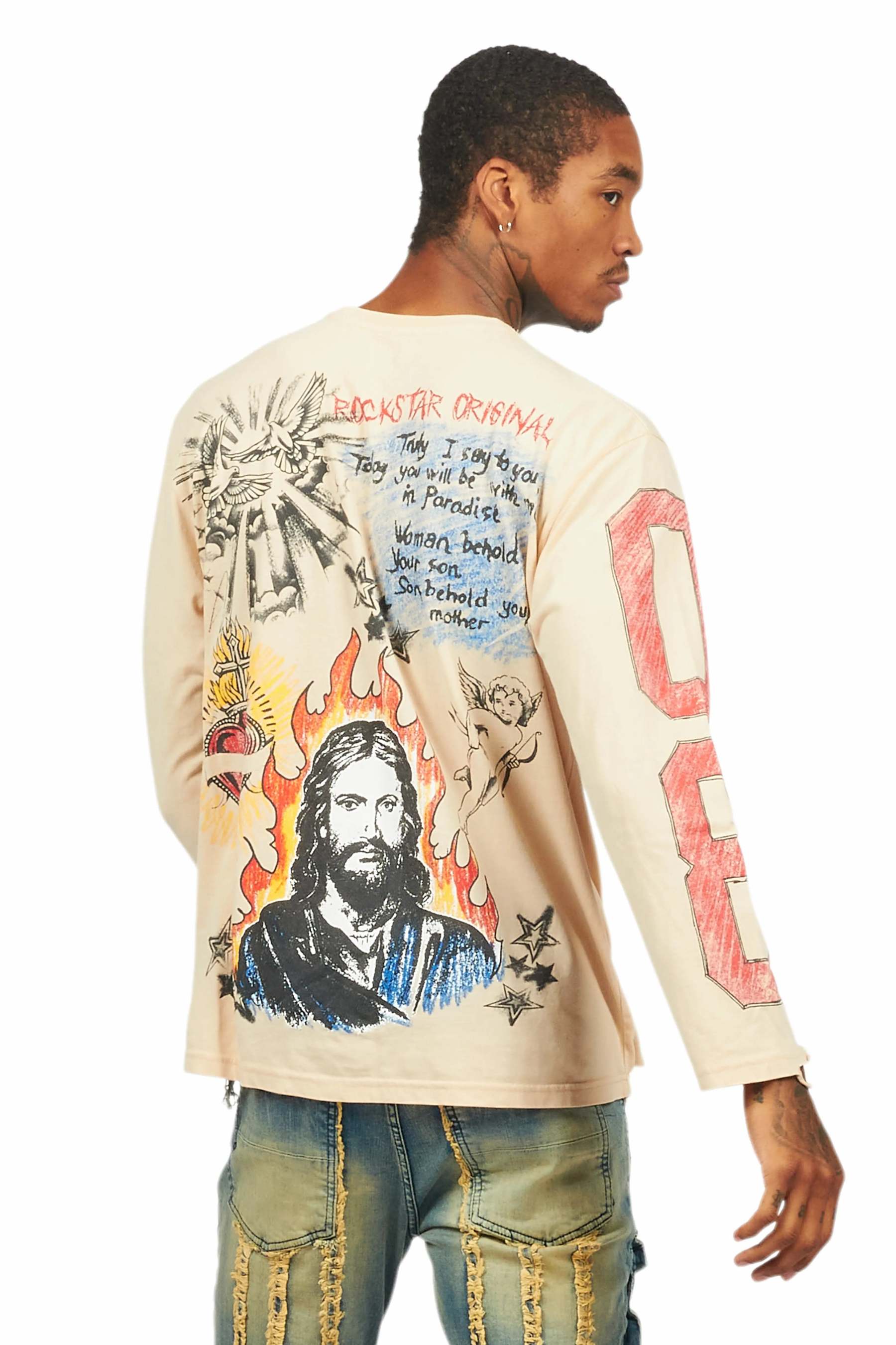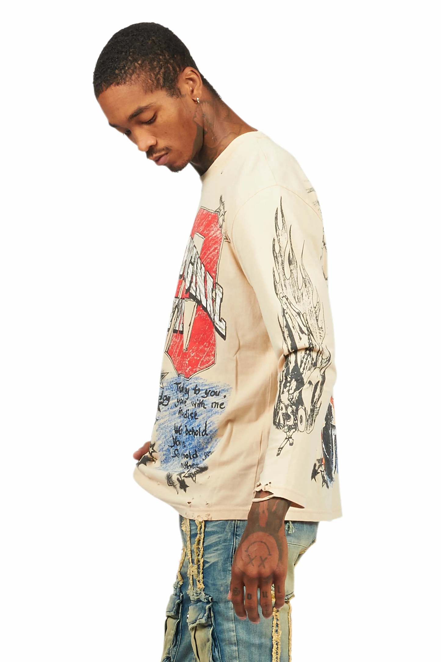 An urban streetwear long sleeve tee for men in beige. Designed with a worn-in wash and custom detailing for a must-cop staple piece tee.