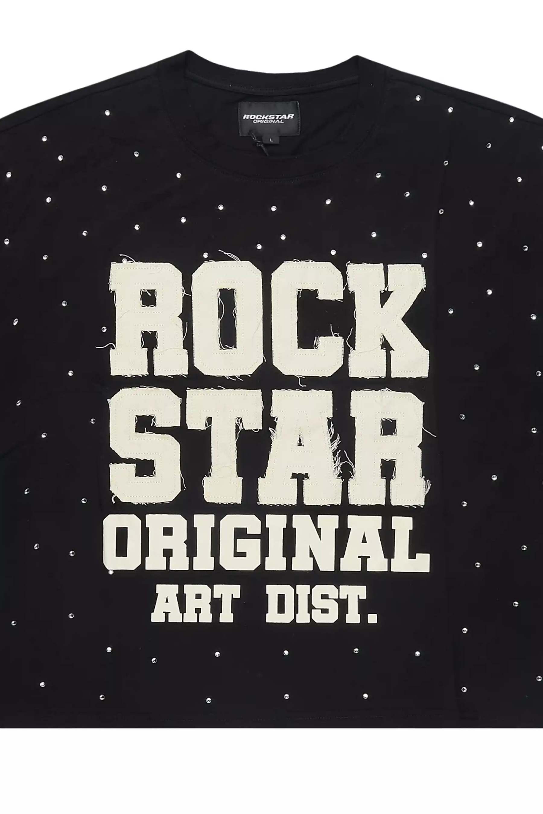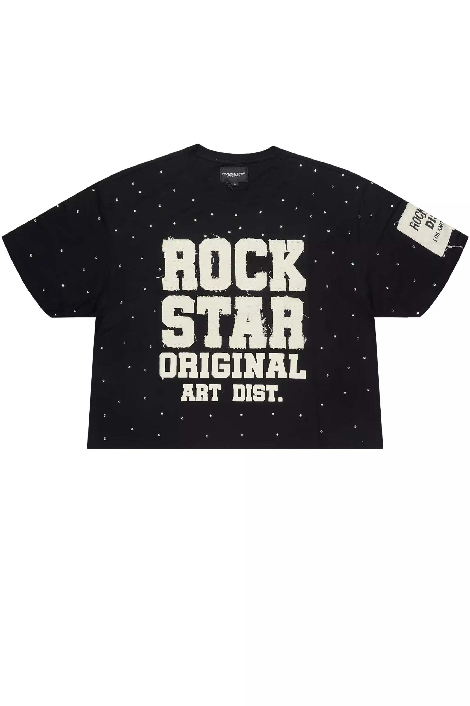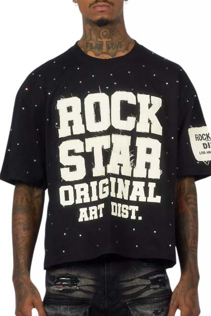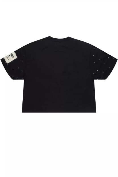 An urban black boxy cropped-length tee for men. Designed with organic cotton and custom rhinestone studded detailing for a dope streetwear style.