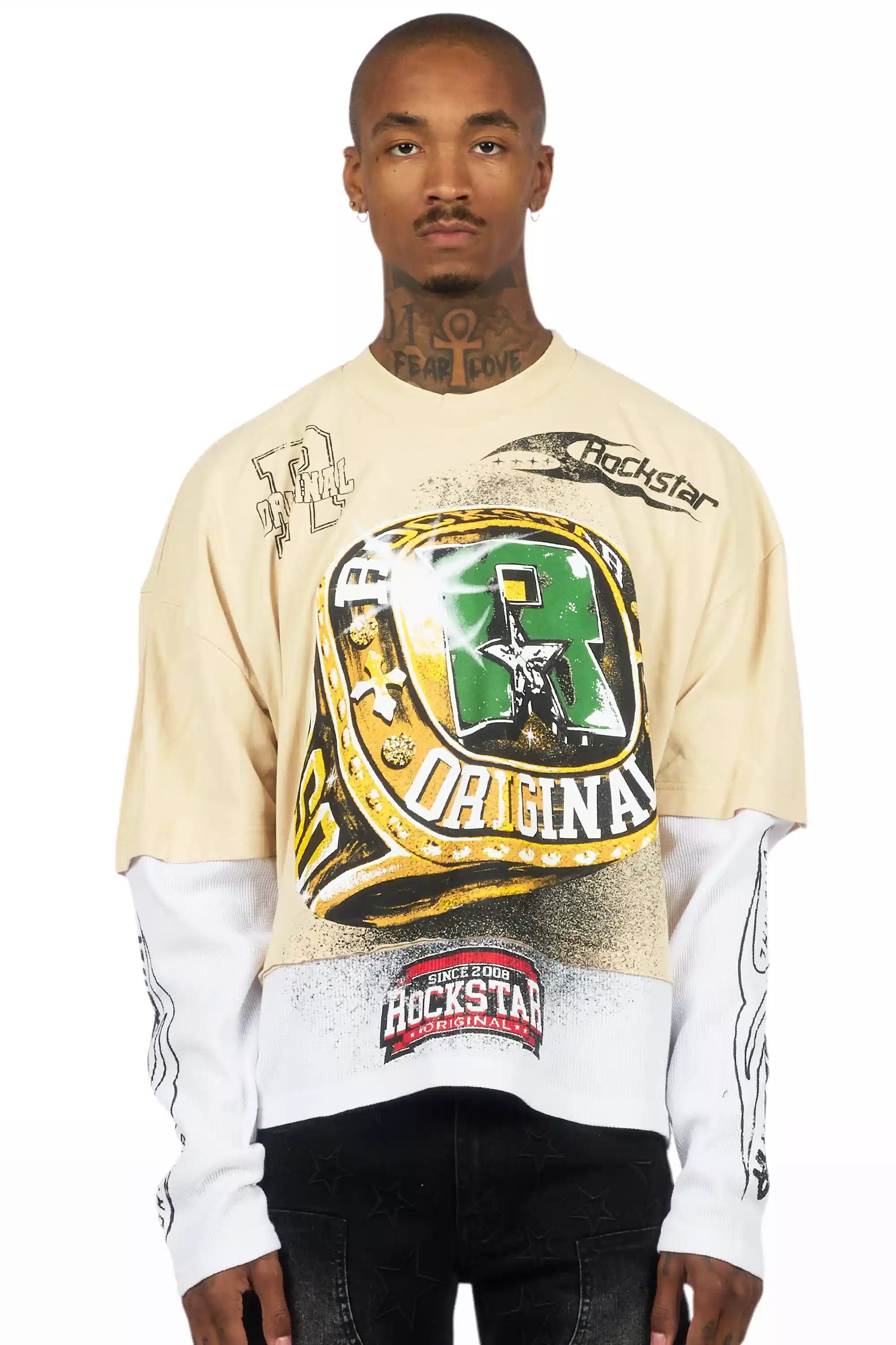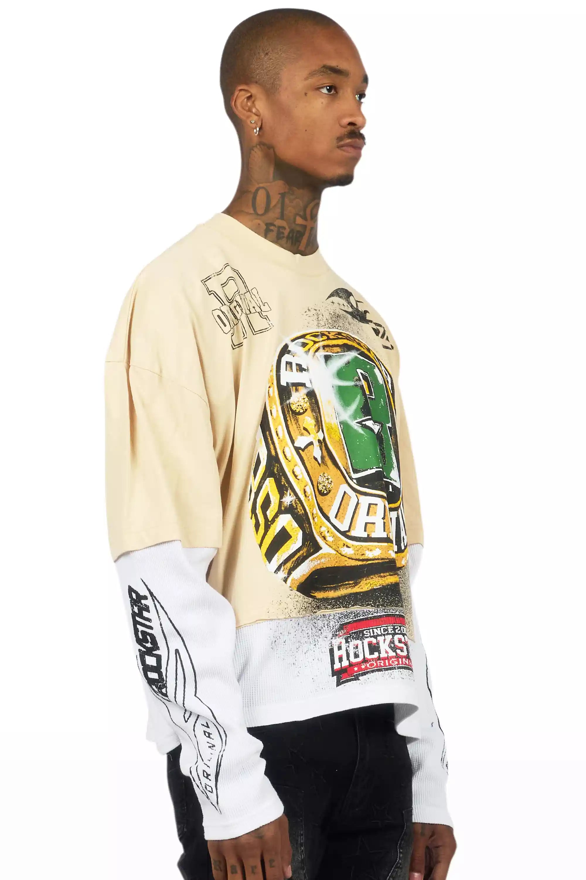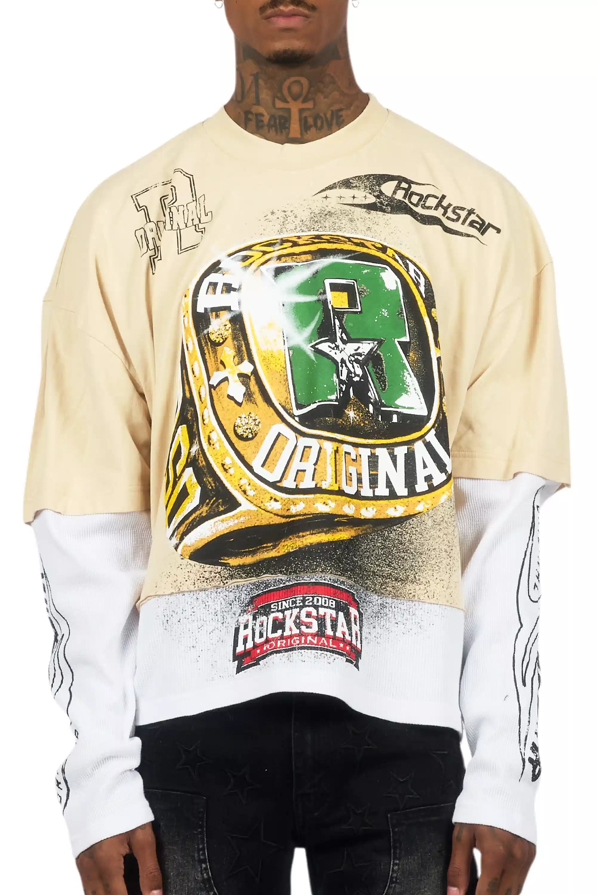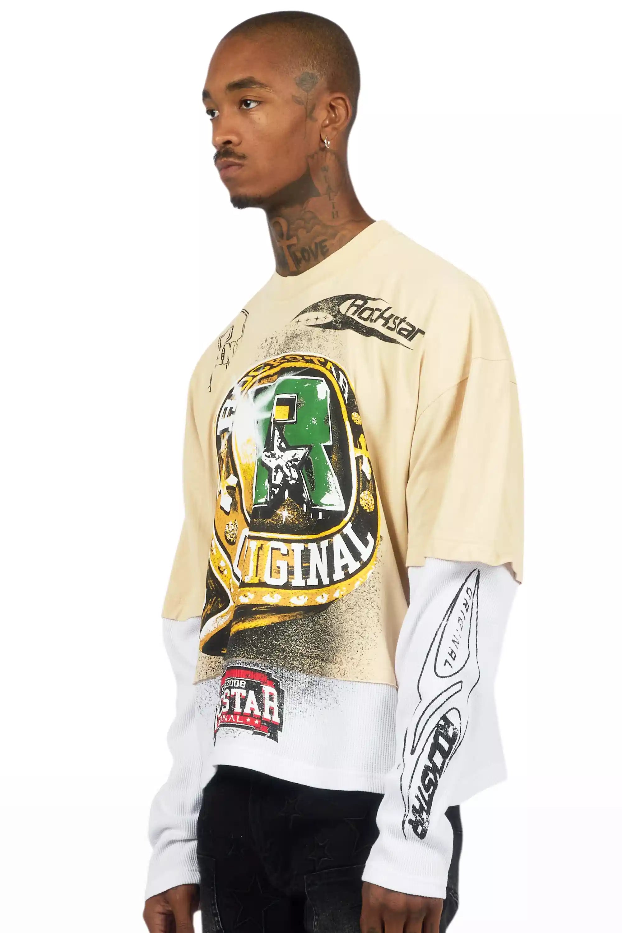 An urban double layer long sleeve thermal and short sleeve tee for men in beige. Designed with organic cotton and a boxy-fit for a dope streetwear style.