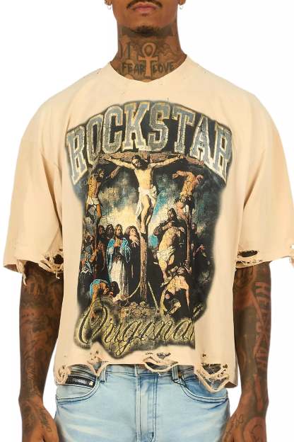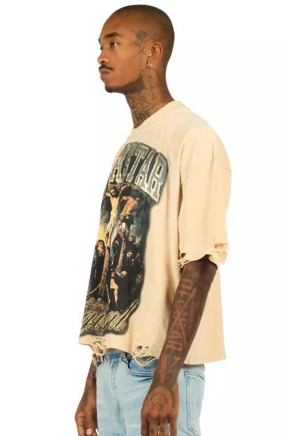 An urban beige boxy cropped-length tee for men. Designed with organic cotton and custom detailing for a dope streetwear style.