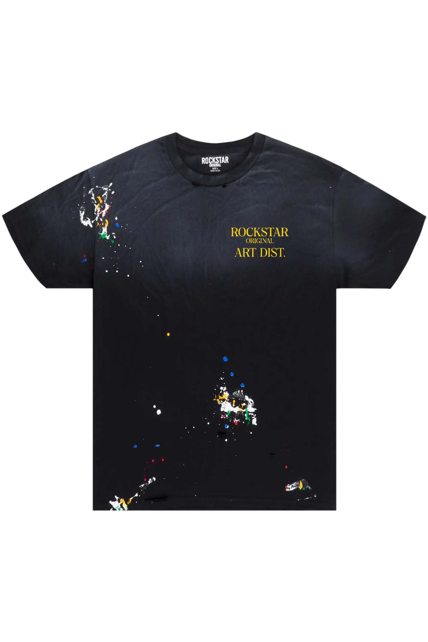 An organic cotton t-shirt for men in black. Designed with a worn-in wash and custom paint detailing for the perfect staple piece tee.