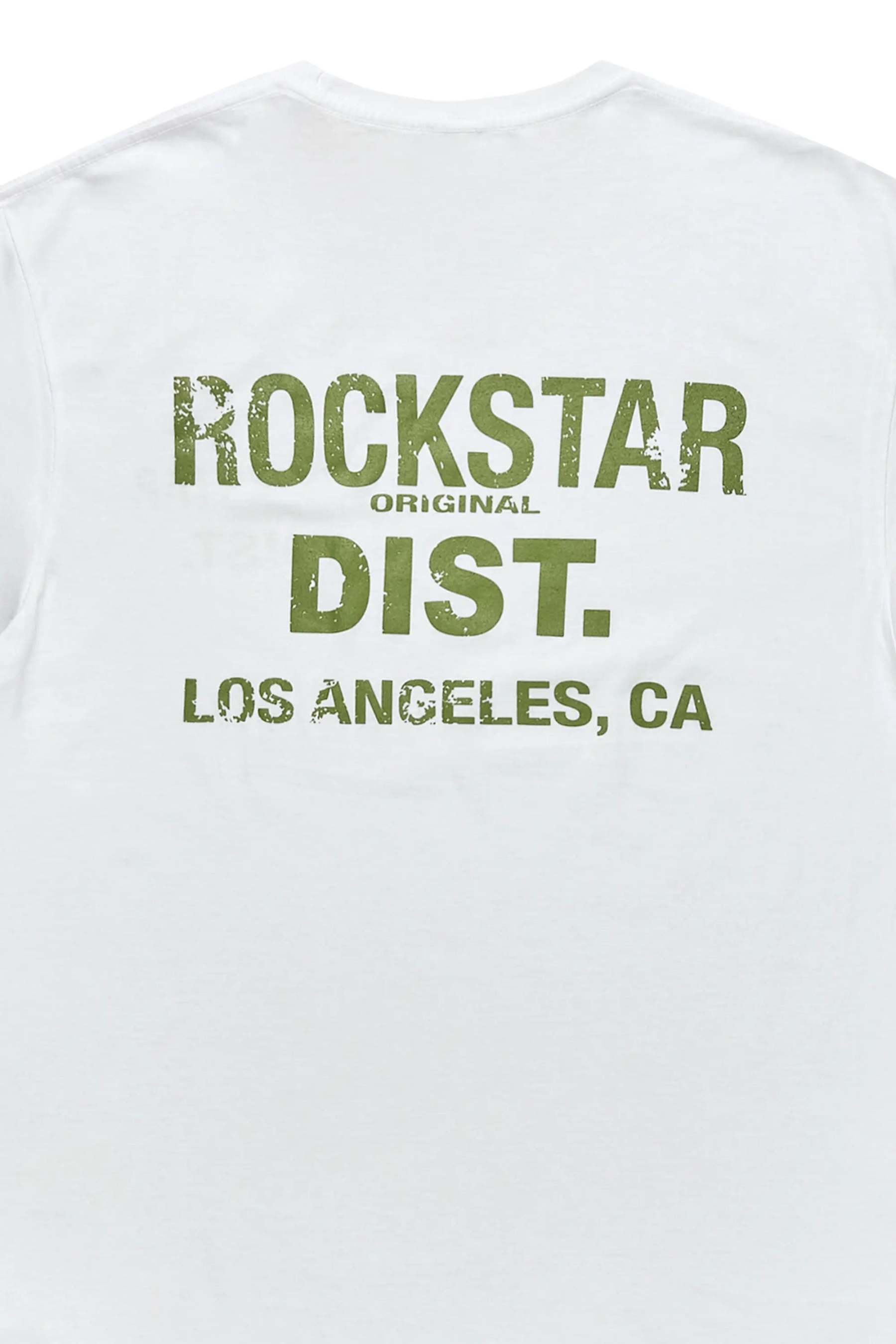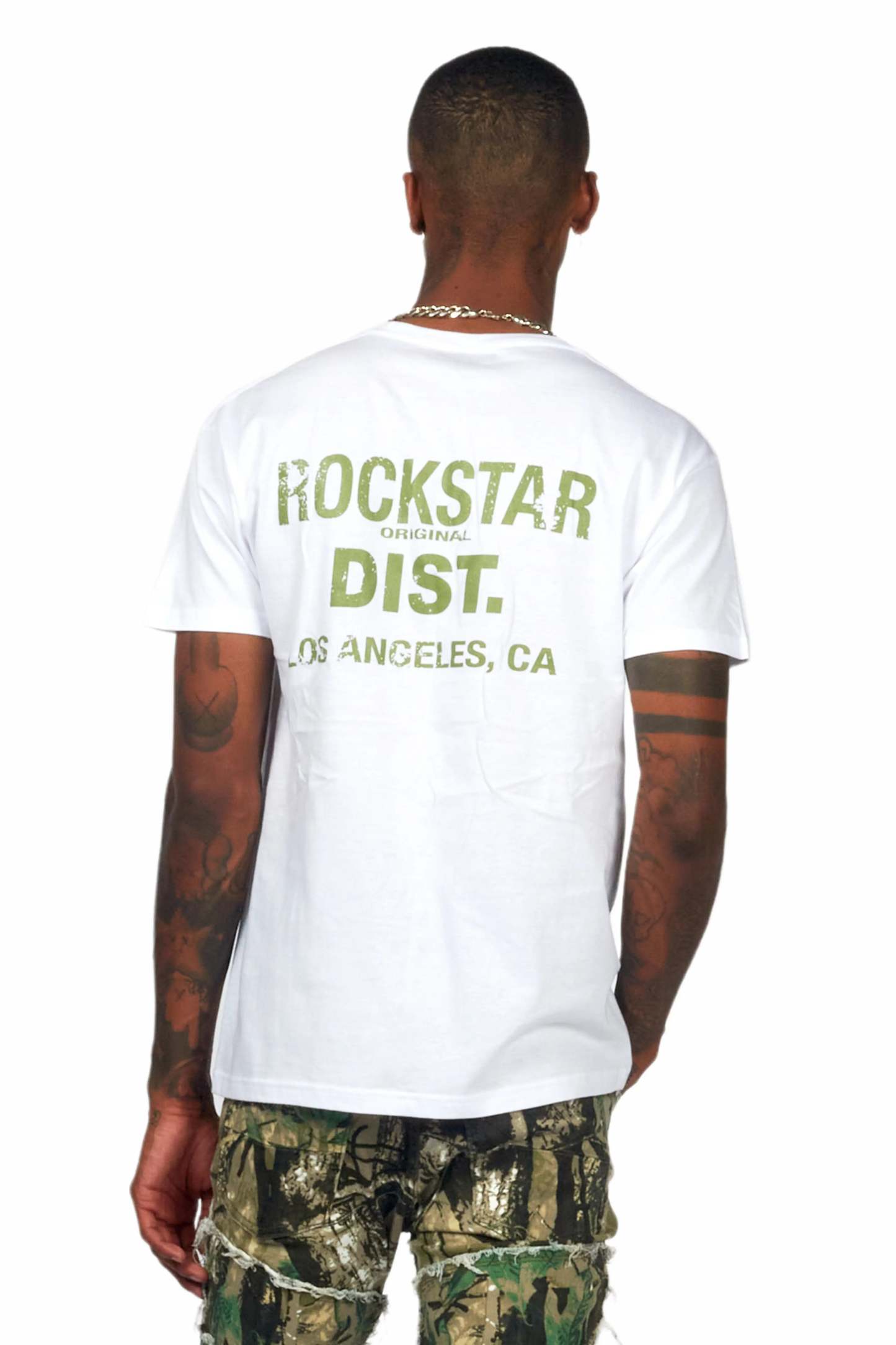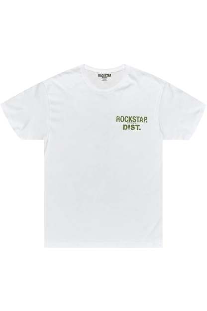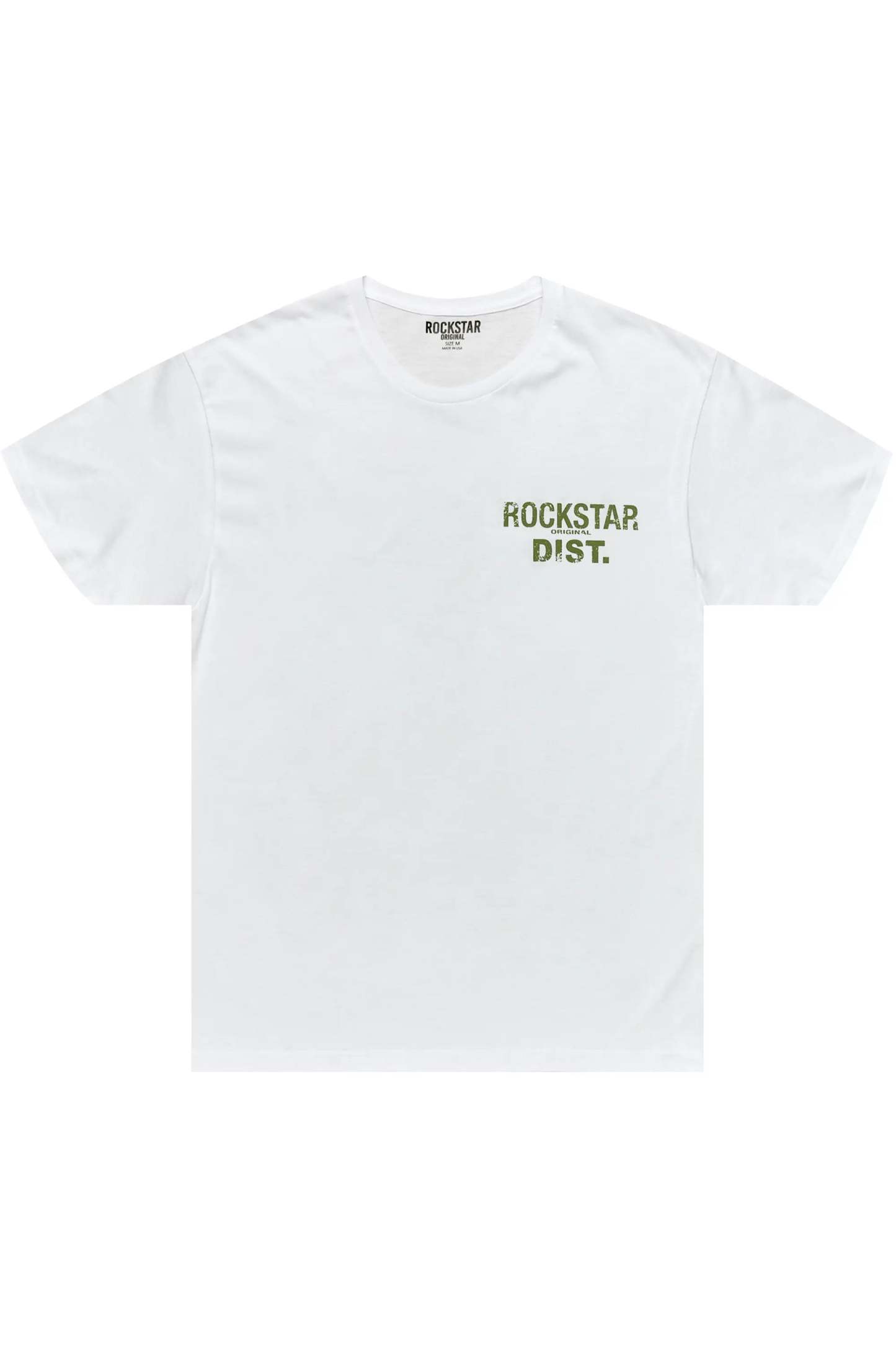 An urban streetwear t-shirt for men in white. Designed with organic cotton and a custom vintage-inspired graphic logo for the perfect staple piece tee.