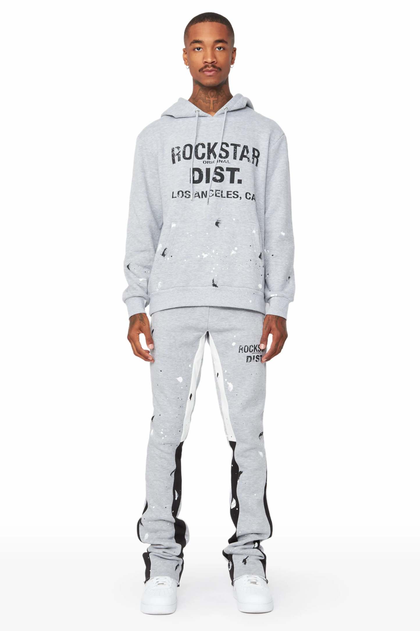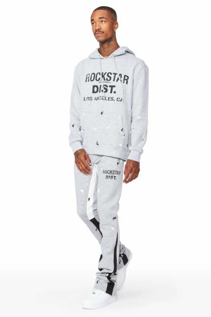 An urban two-piece stack flare tracksuit set for men in heather grey. Designed with extra long legs and custom paint splatter for a dope streetwear set.