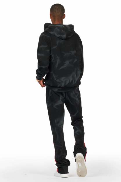 An urban two-piece stack flare track set for men in black. Designed with extra long legs and worn-in wash for a dope streetwear set.