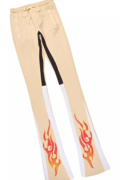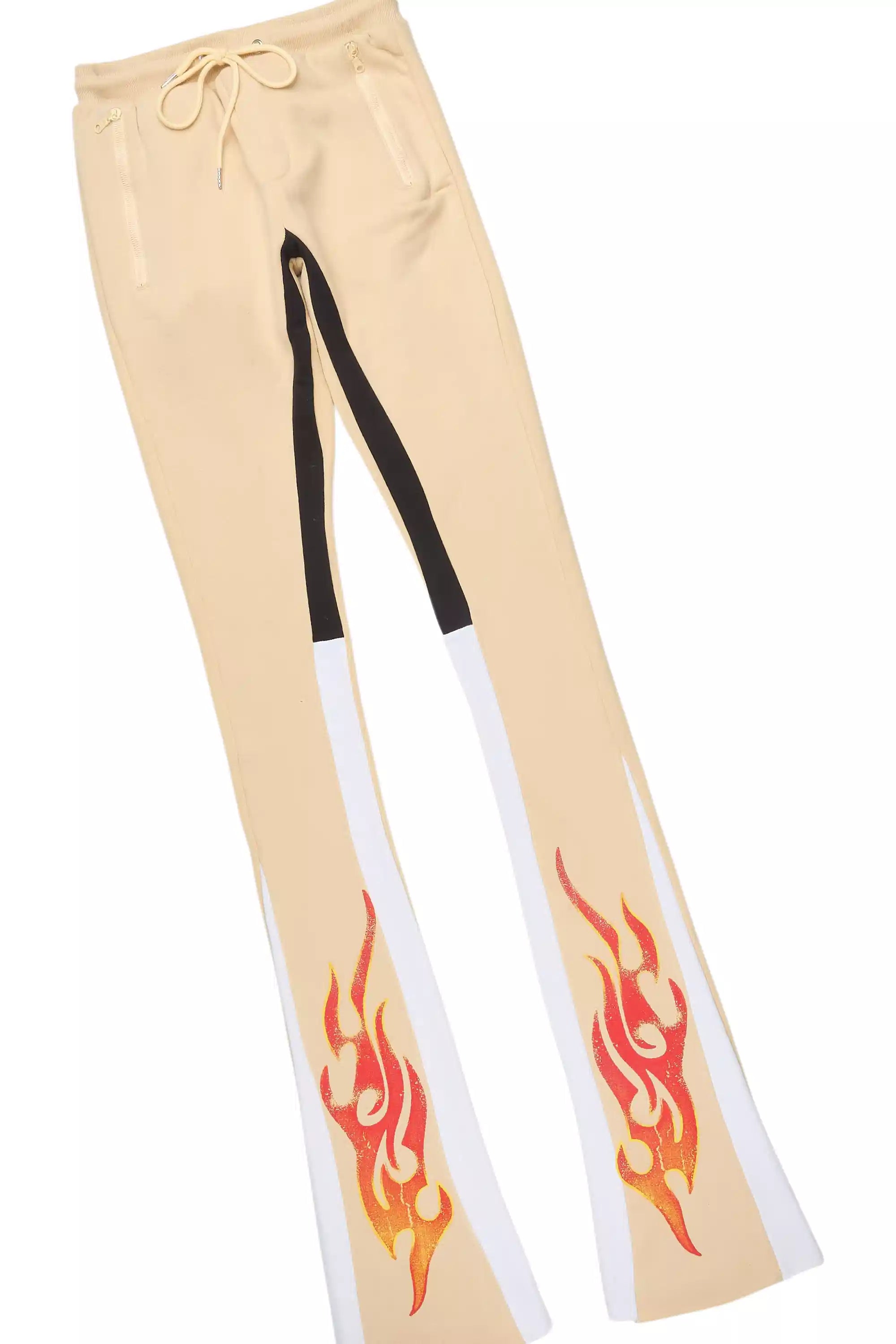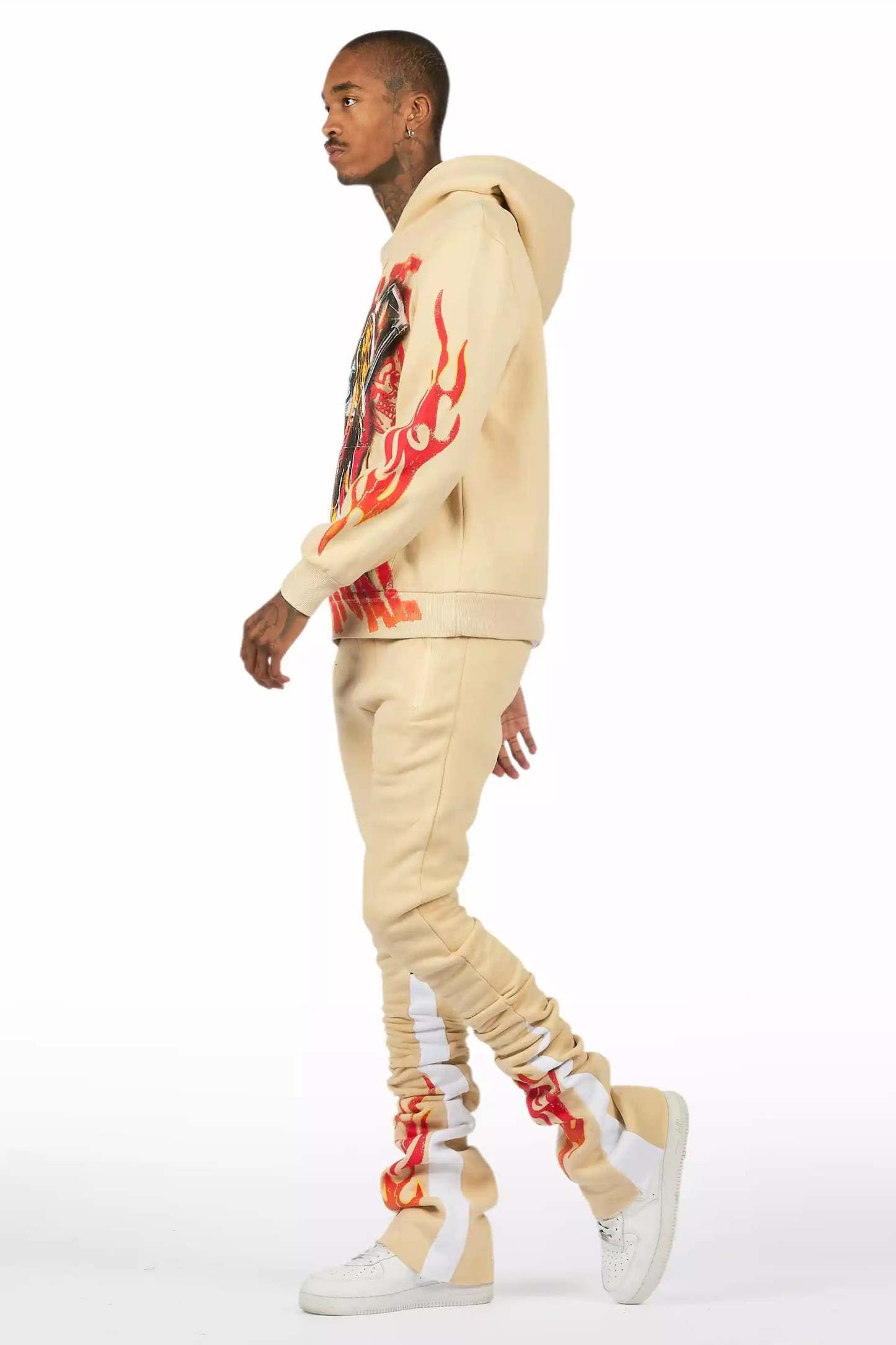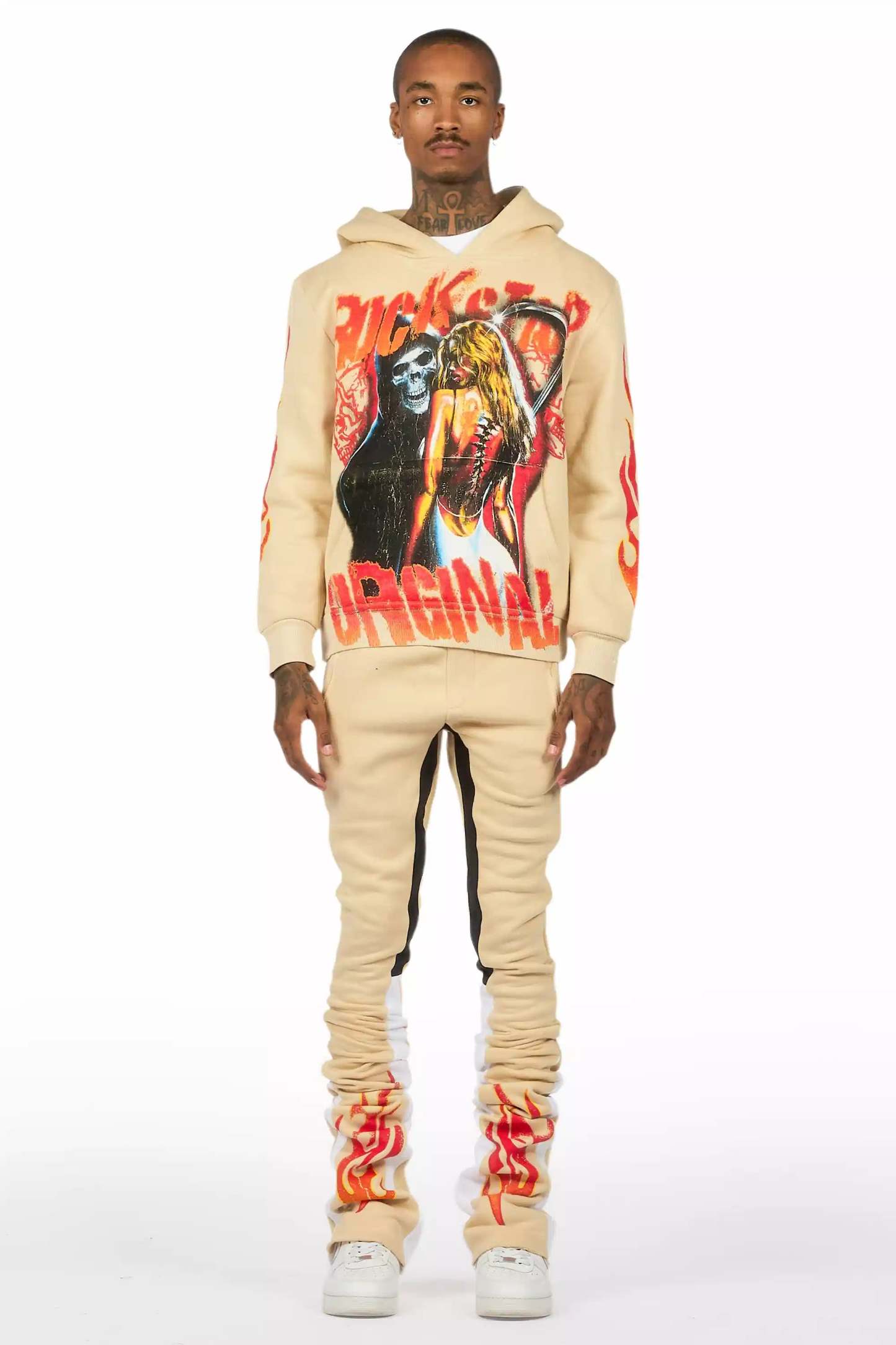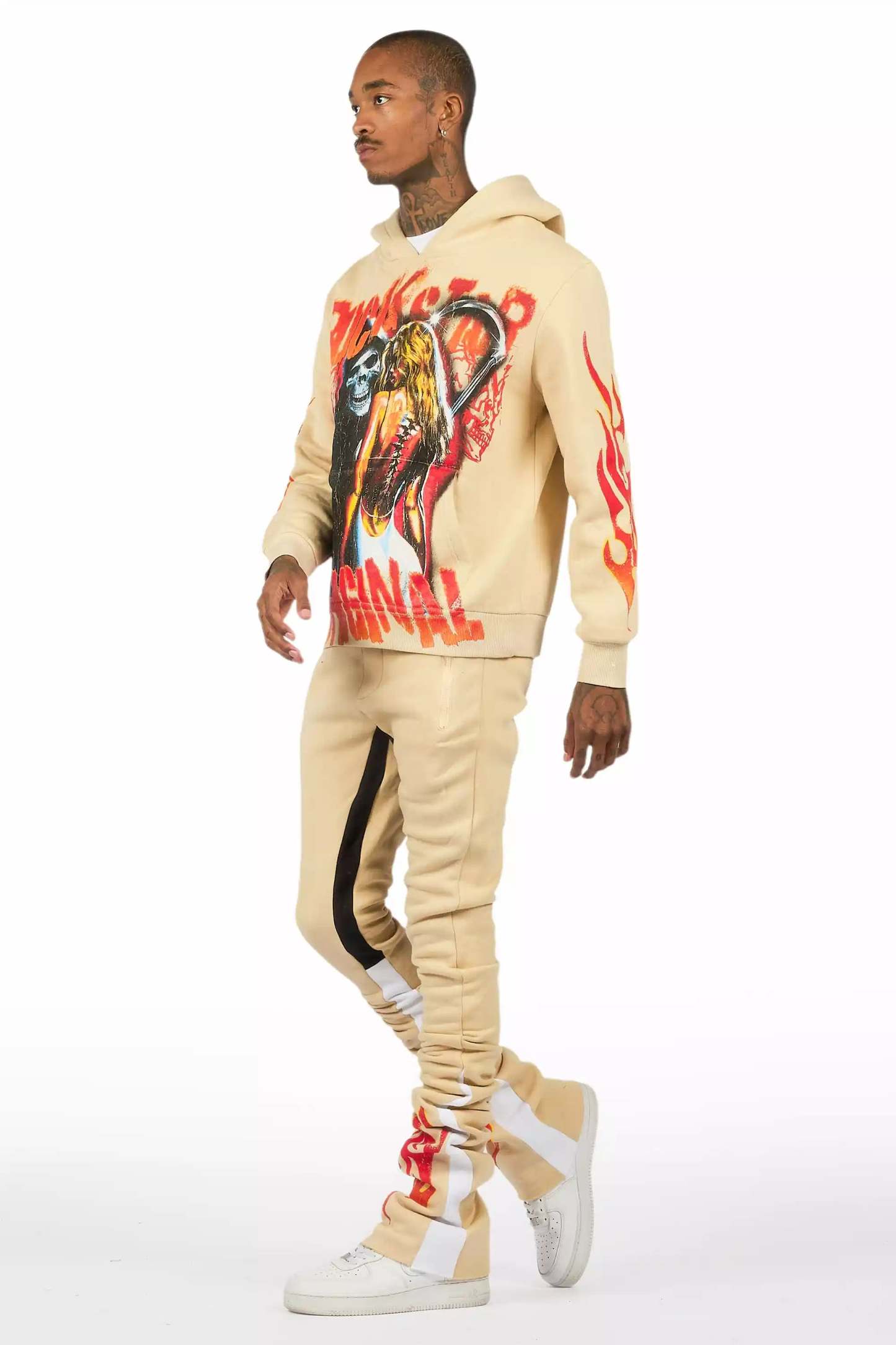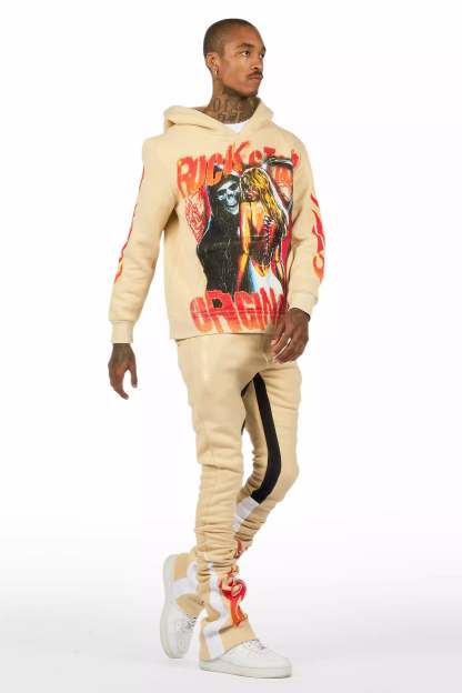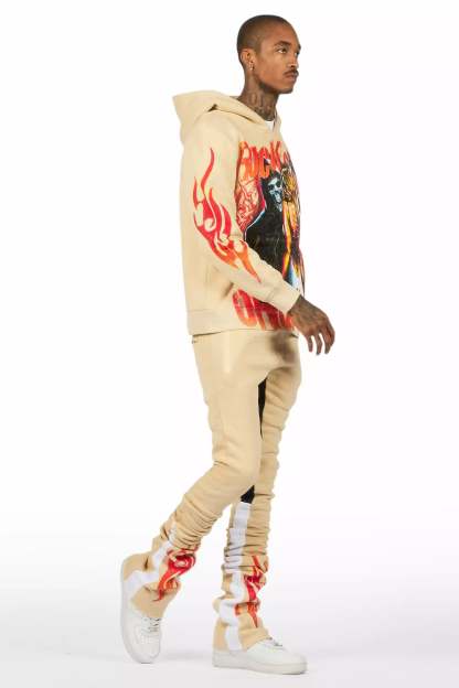 An urban two-piece hoodie and super stacked trackpant set for men in beige. Designed with extra long legs and custom detailingfor a dope streetwear track set.