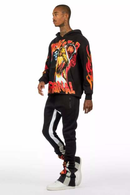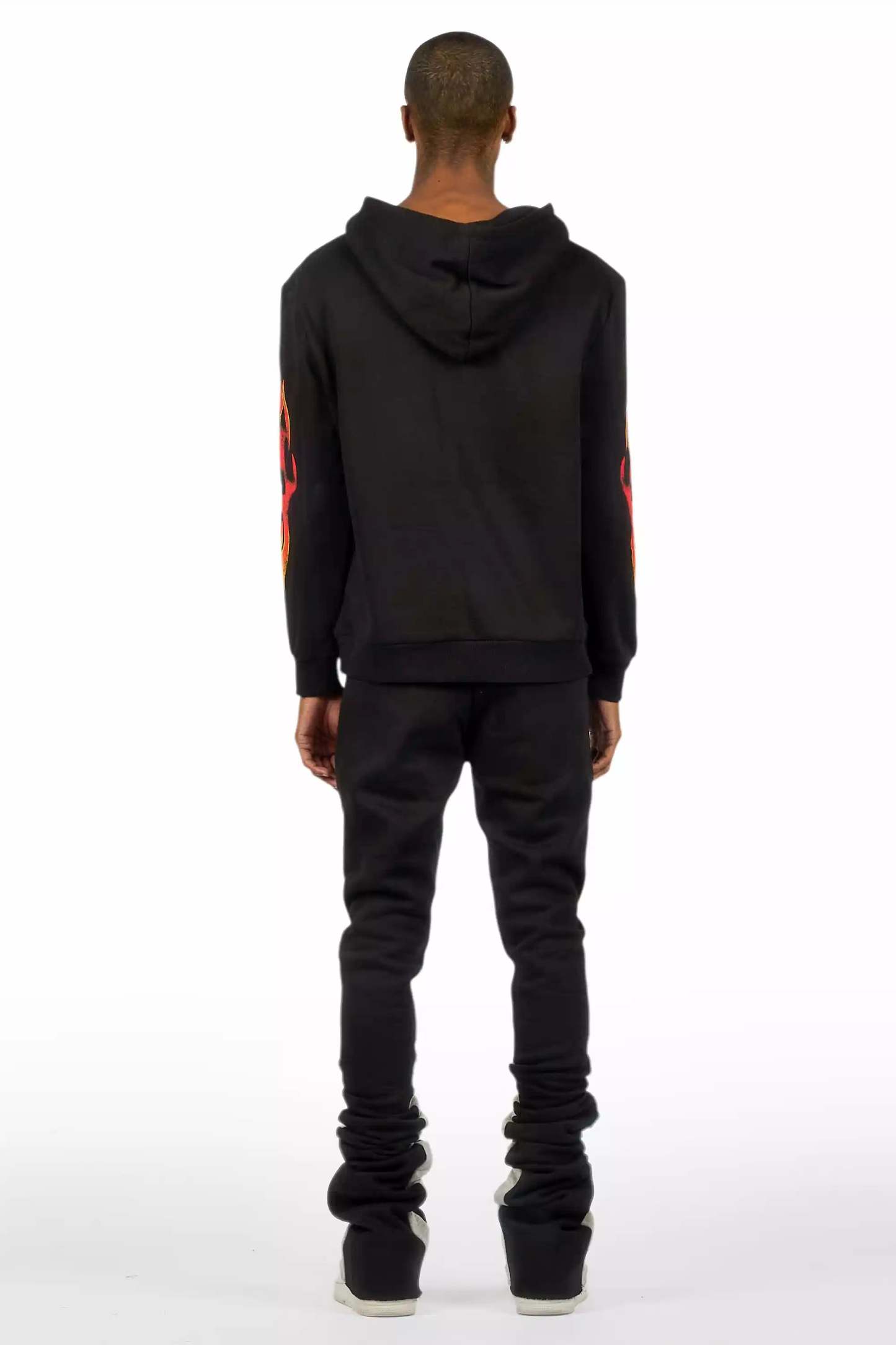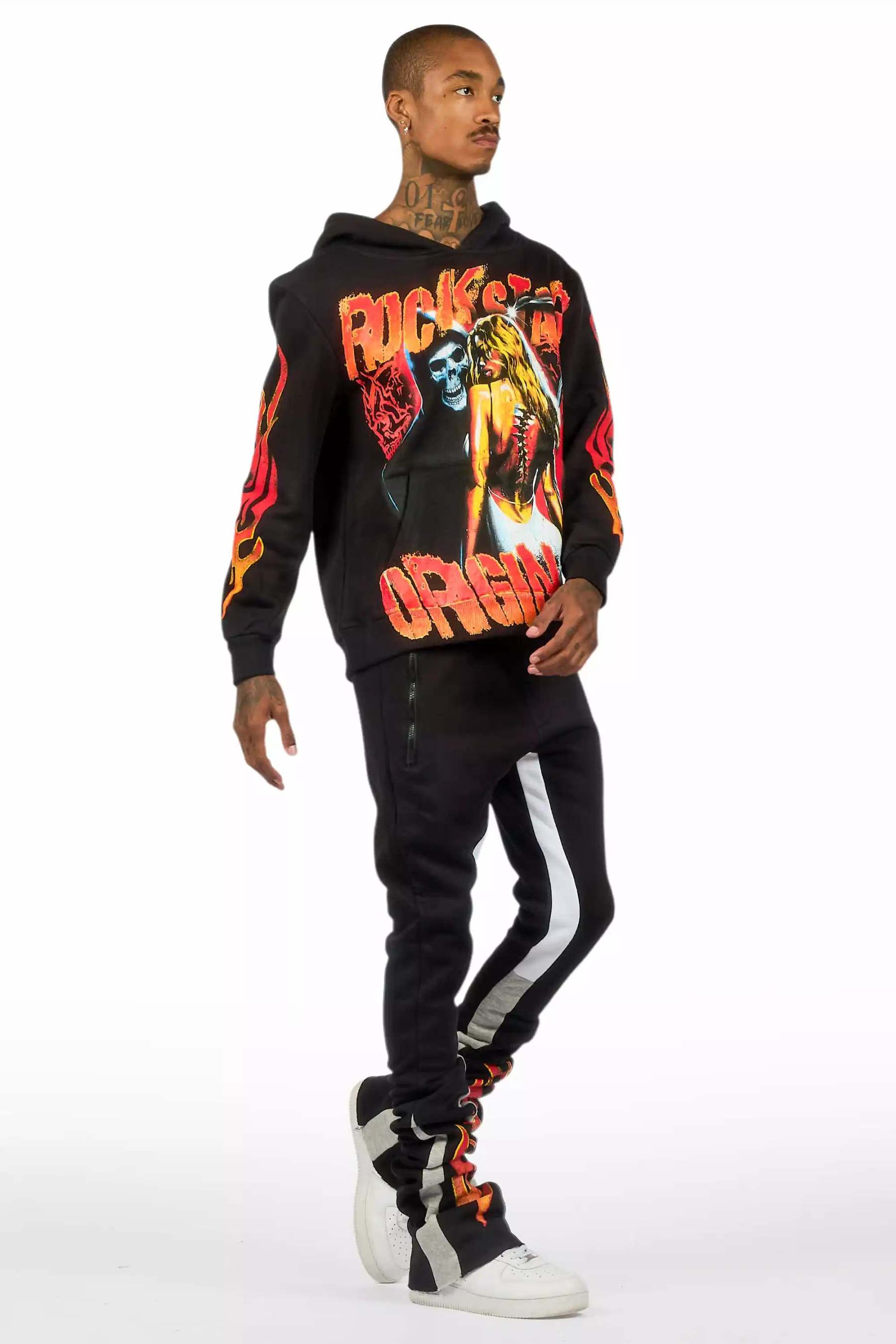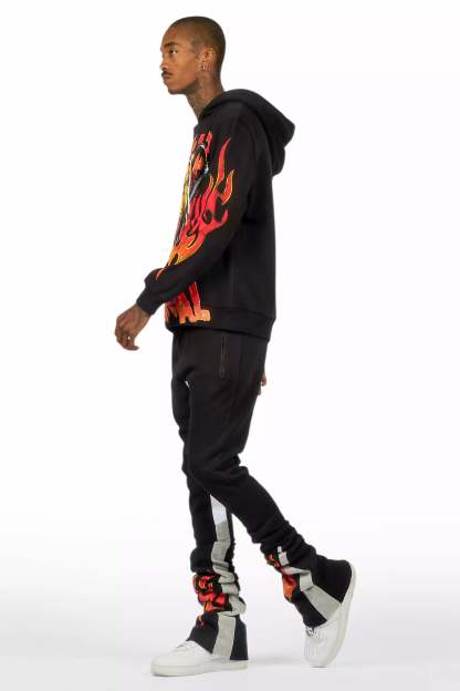 An urban two-piece hoodie and super stacked trackpant set for men in black. Designed with extra long legs and custom detailingfor a dope streetwear track set.