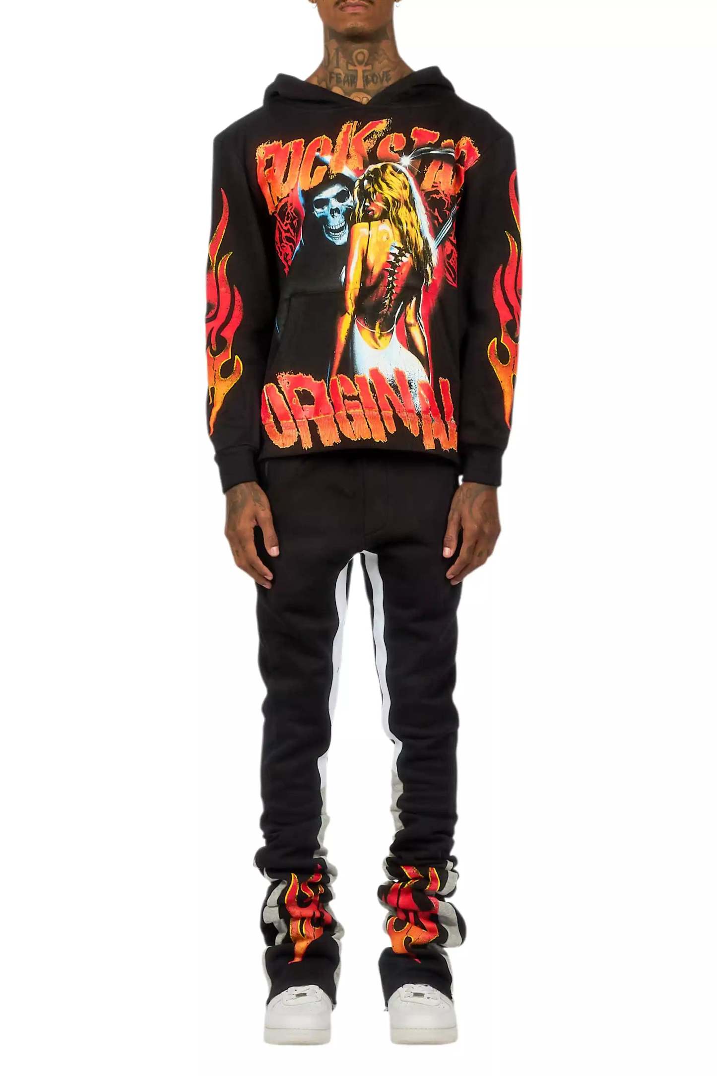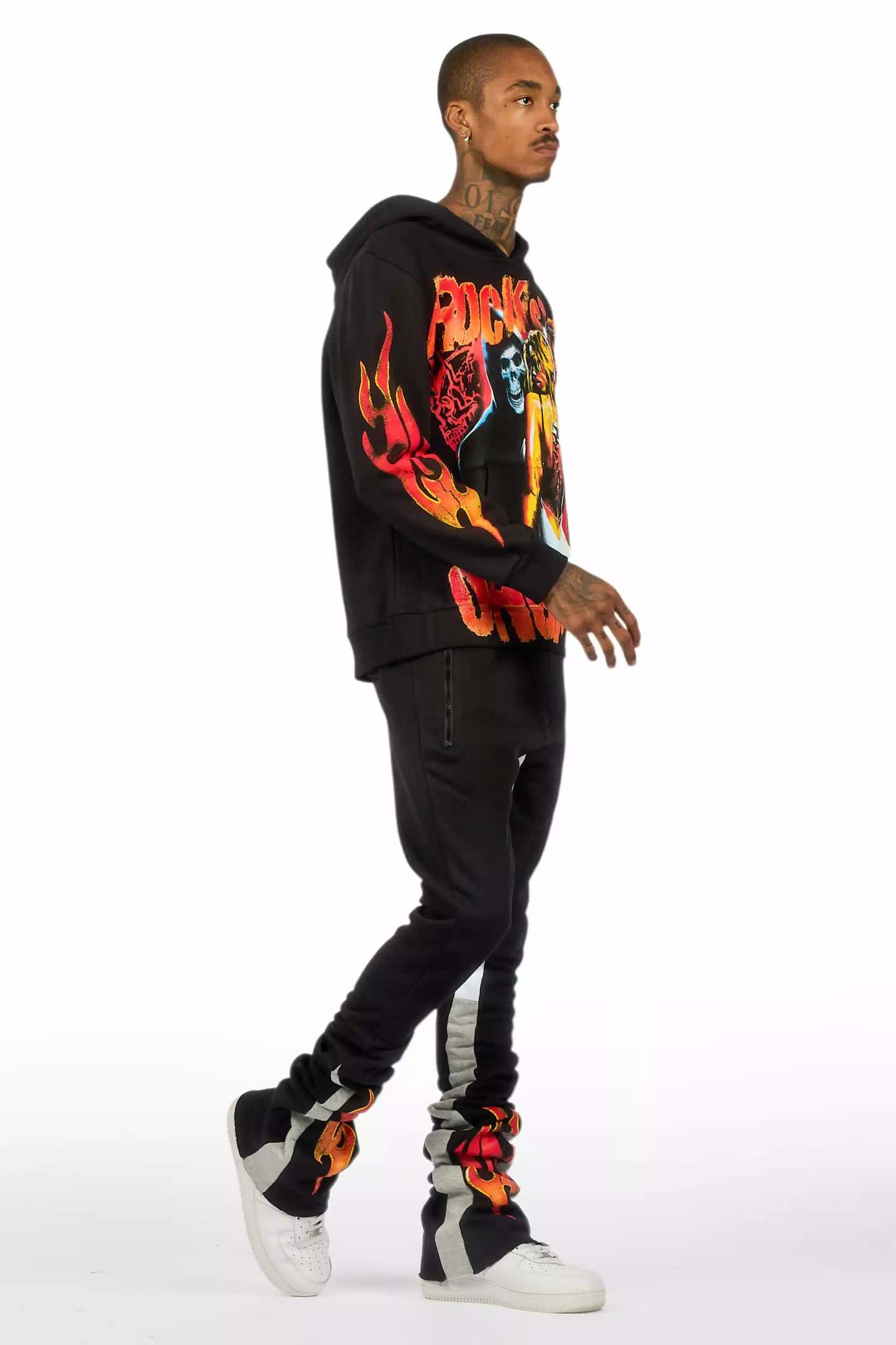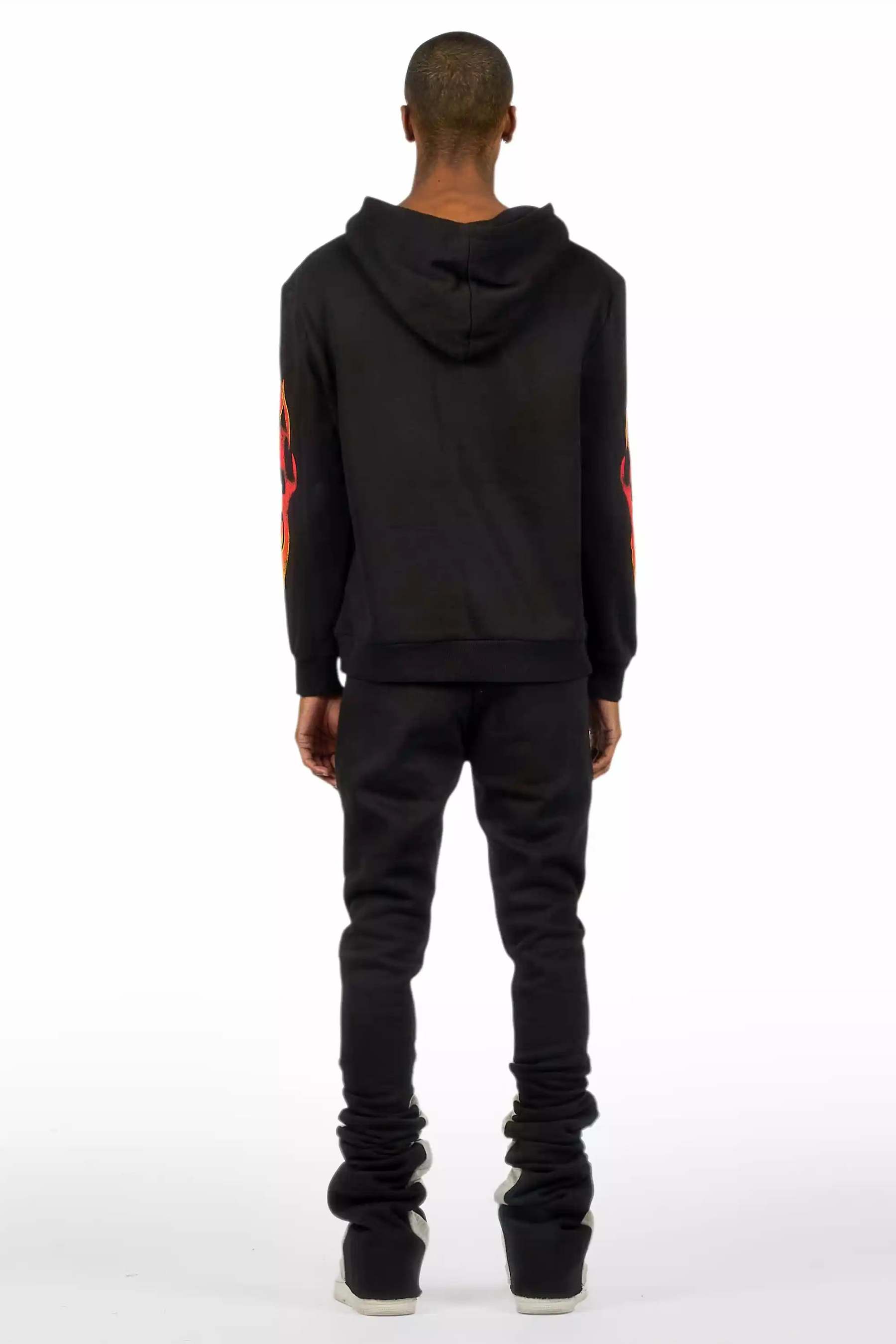 An urban two-piece hoodie and super stacked trackpant set for men in black. Designed with extra long legs and custom detailingfor a dope streetwear track set.