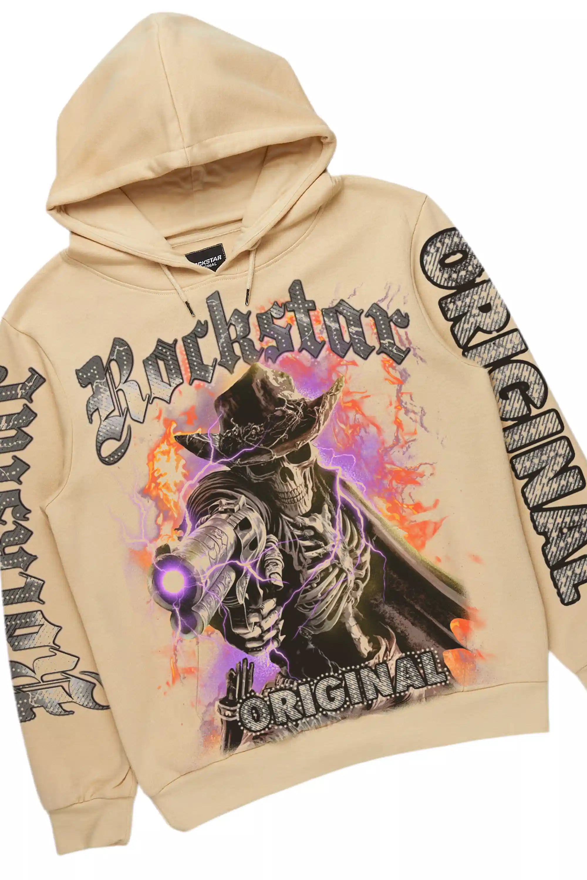 An urban two-piece hoodie and baggy stack track pant set for men in beige. Designed with organic cotton and custom detailing for a must-cop streetwear set.