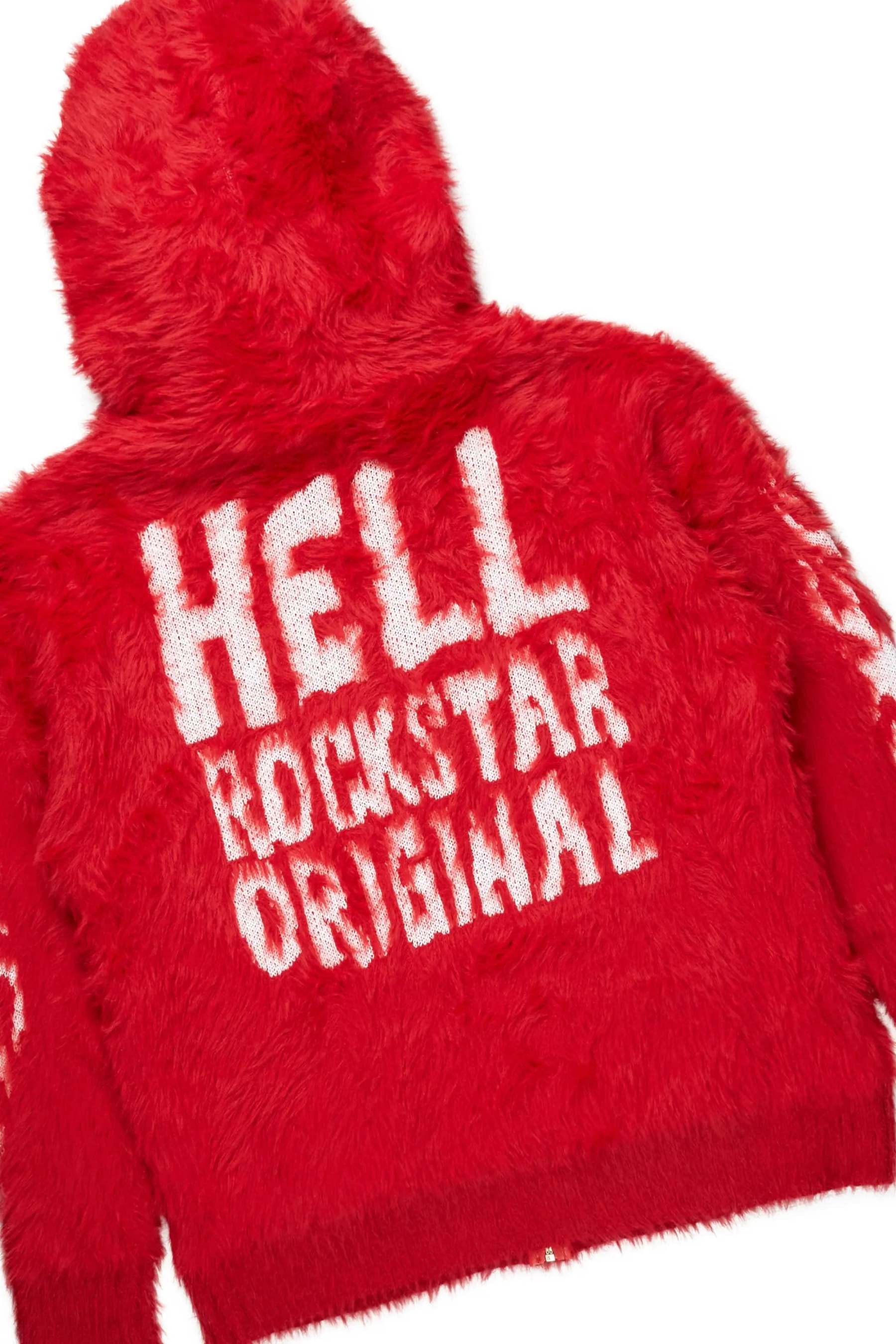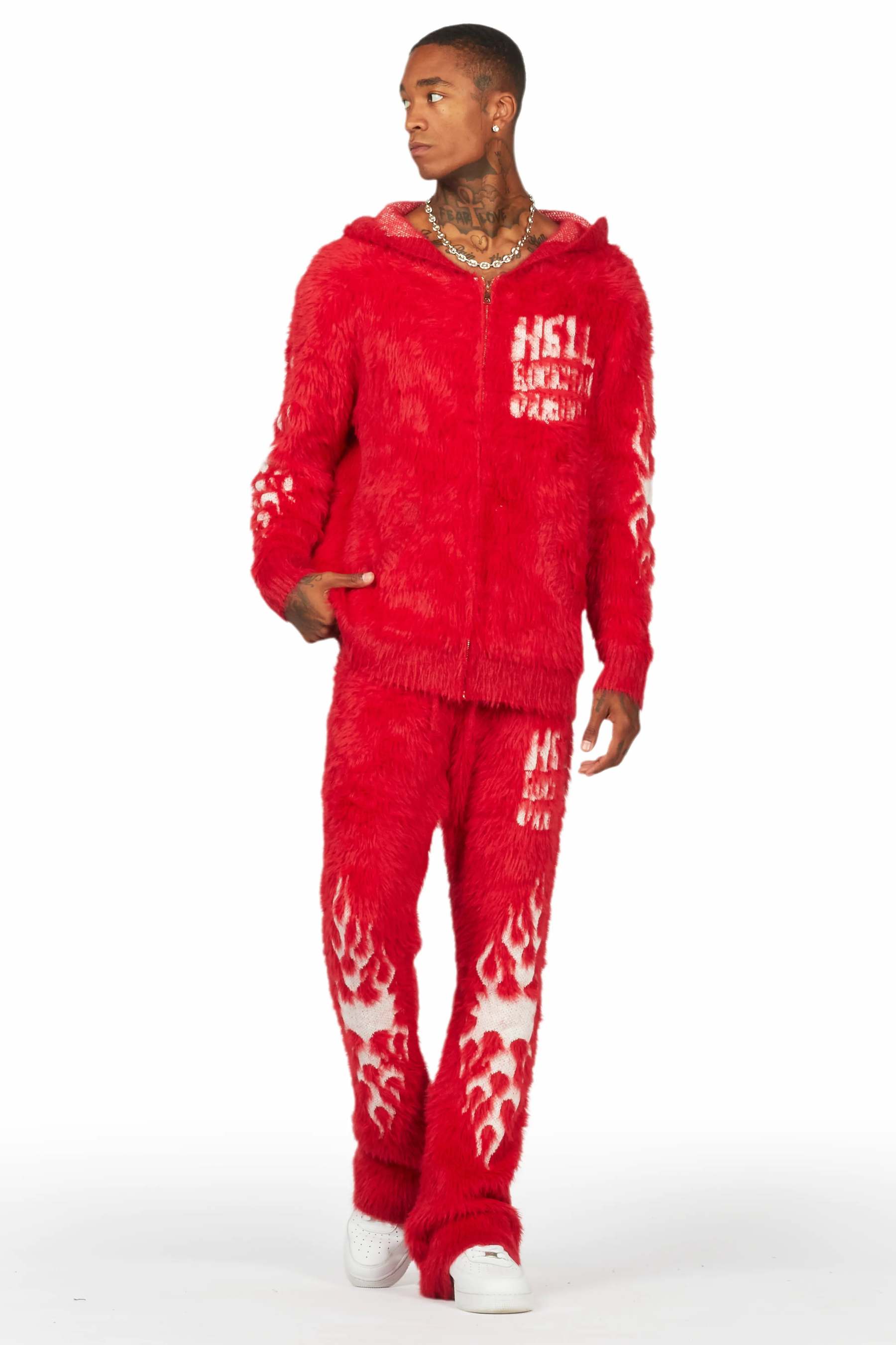 An urban two-piece zip-up jacket and track pant set for men in red. Designed with ultra soft knitted fabric and extra long legs for a must-cop streetwear set.