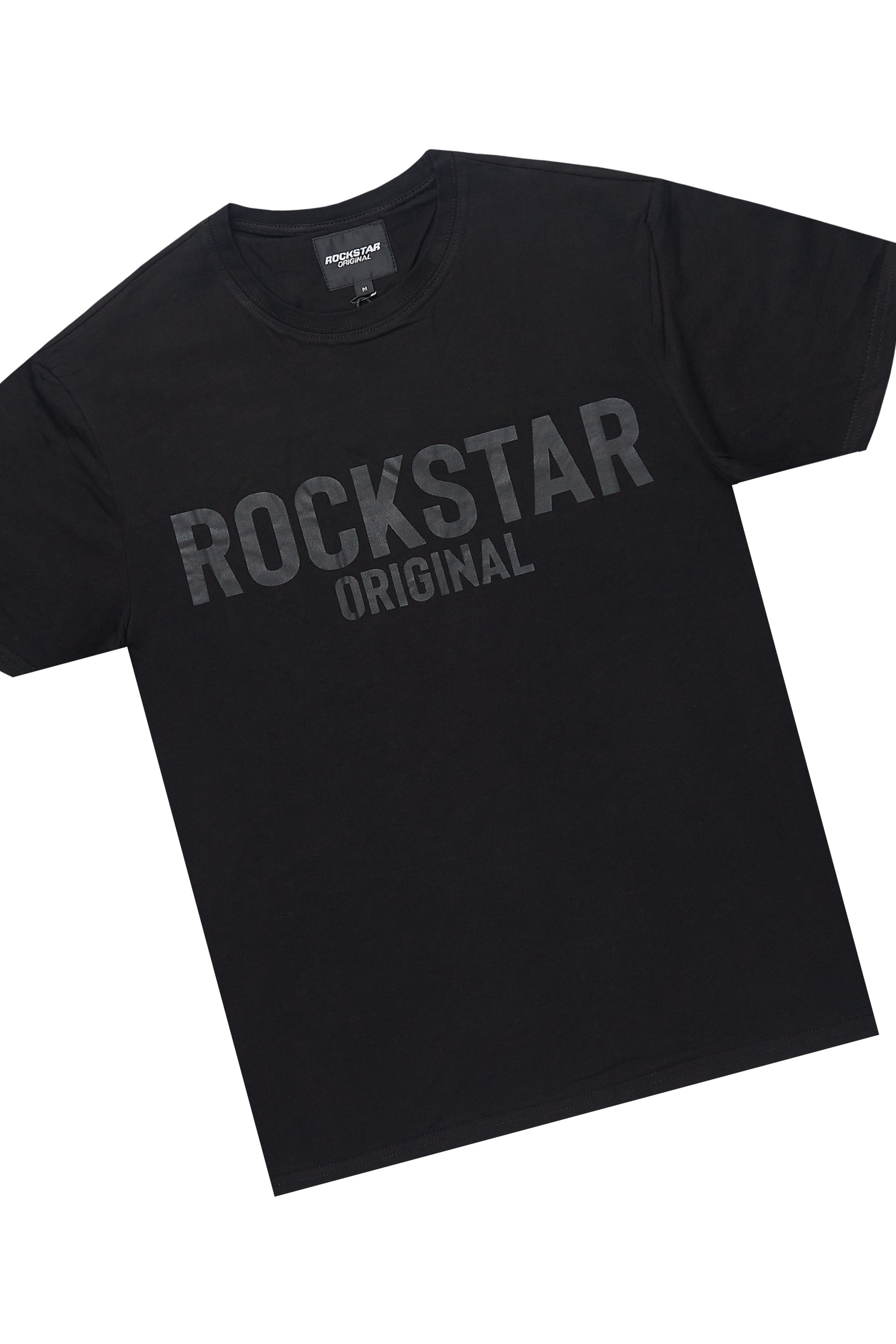 An urban two-piece t-shirt and stacked pant tracksuit set for men in black. Designed with ultra soft fabric and extra long legs for a dope streetwear set.