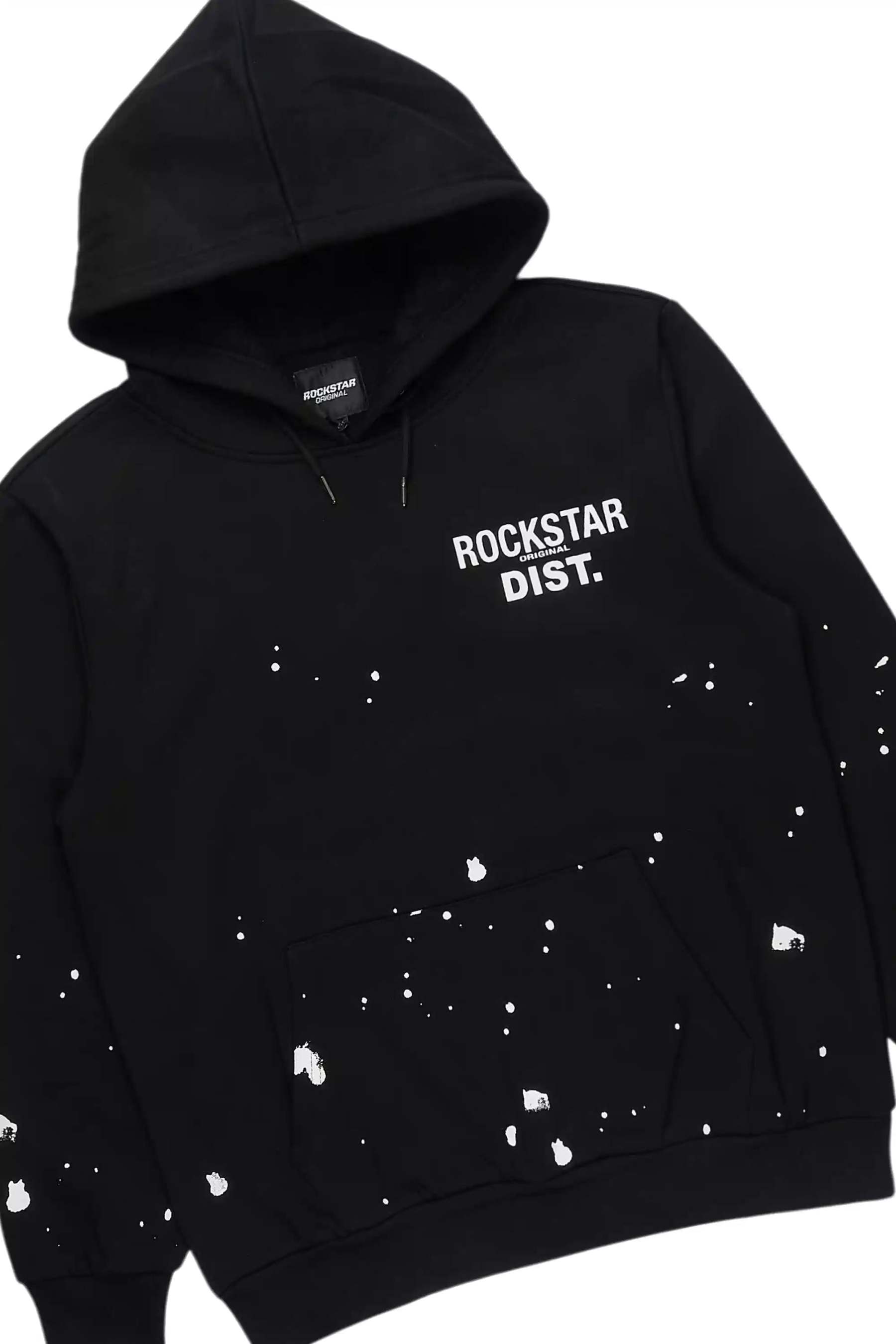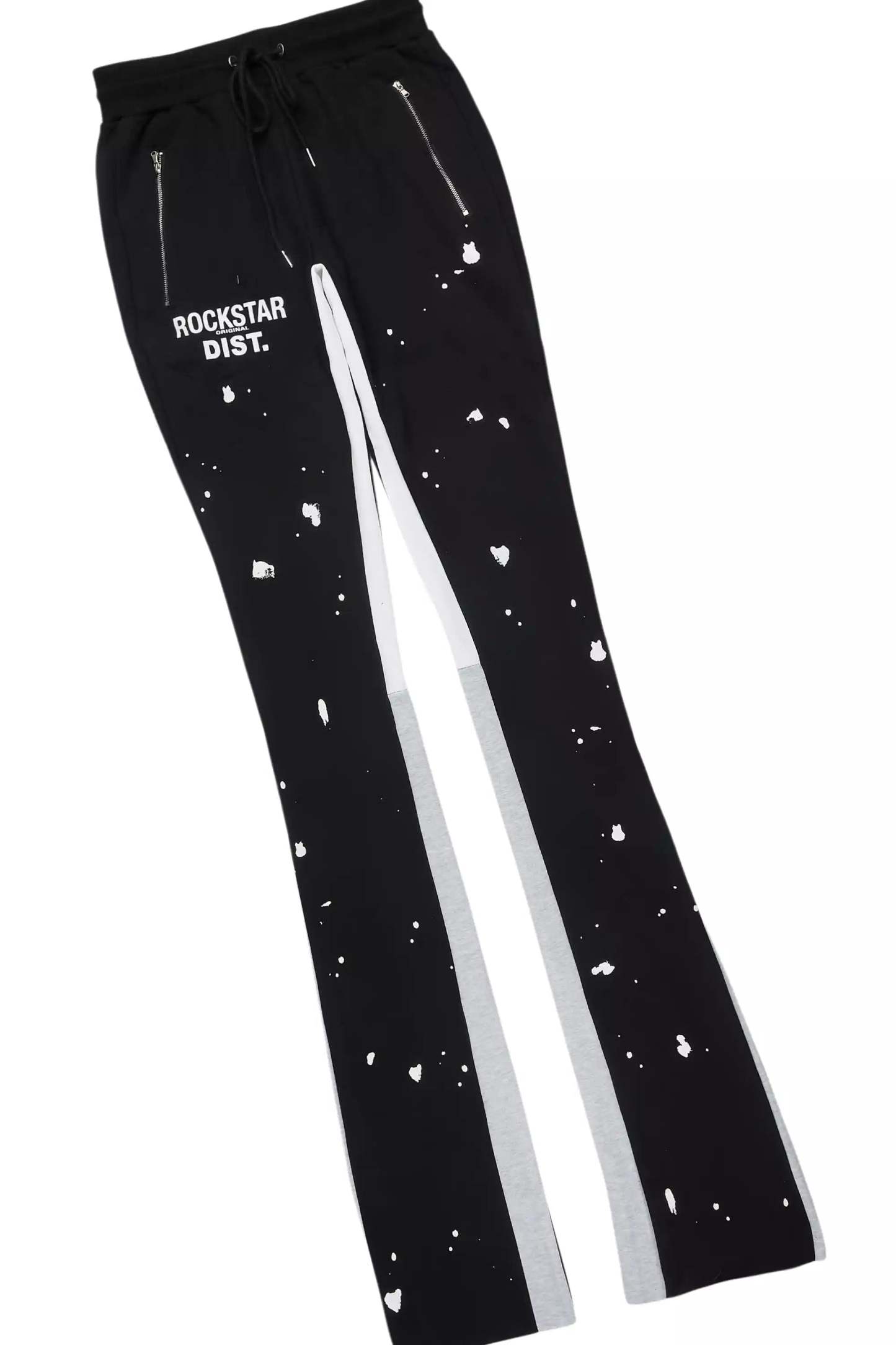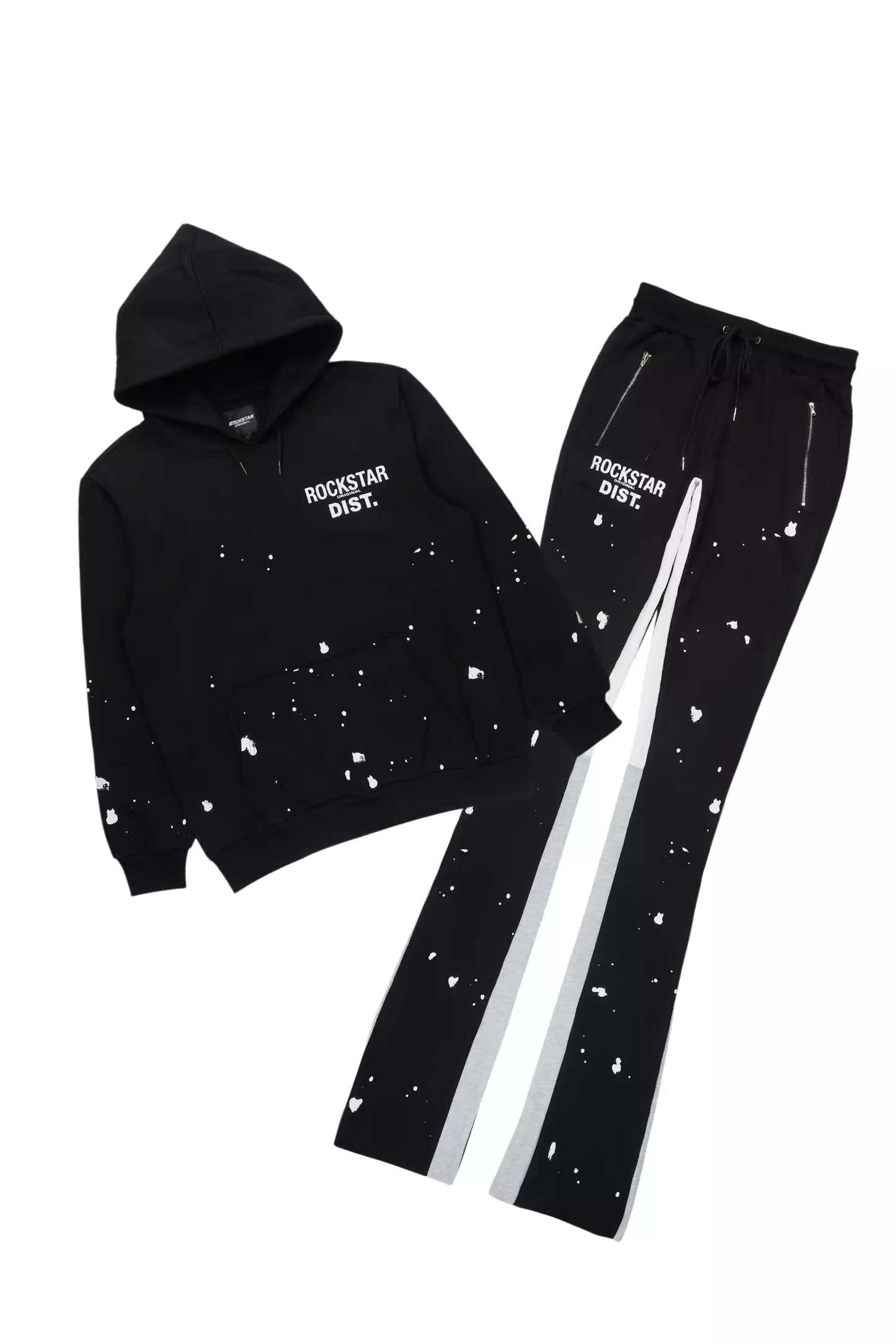 An urban two-piece super stack flare track set for men in black. Designed with extra long legs and custom paint splatter detailing for a dope streetwear set.