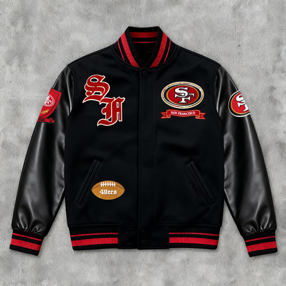Street 49ers Print Leather Patchwork Baseball Jacket