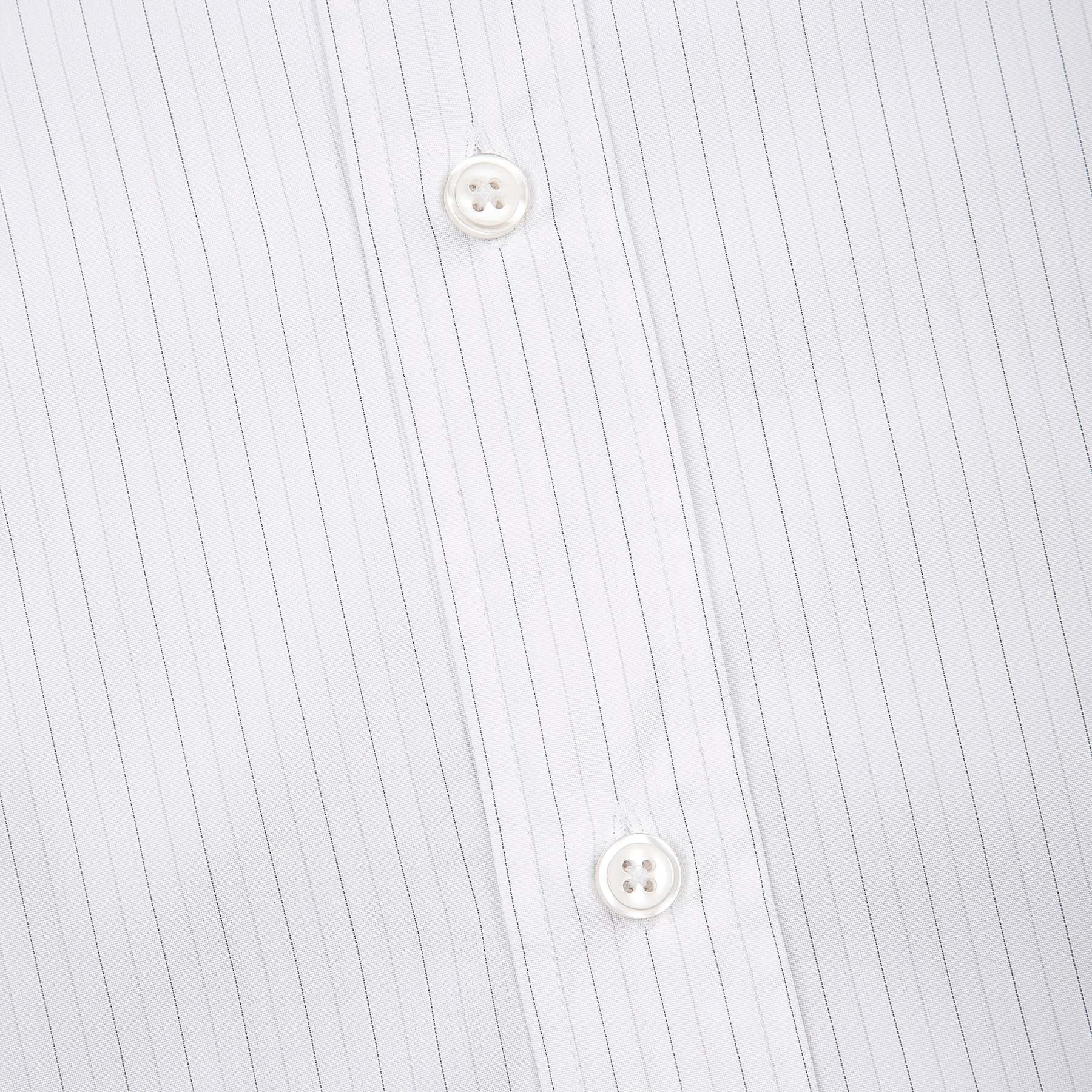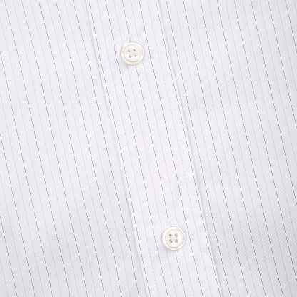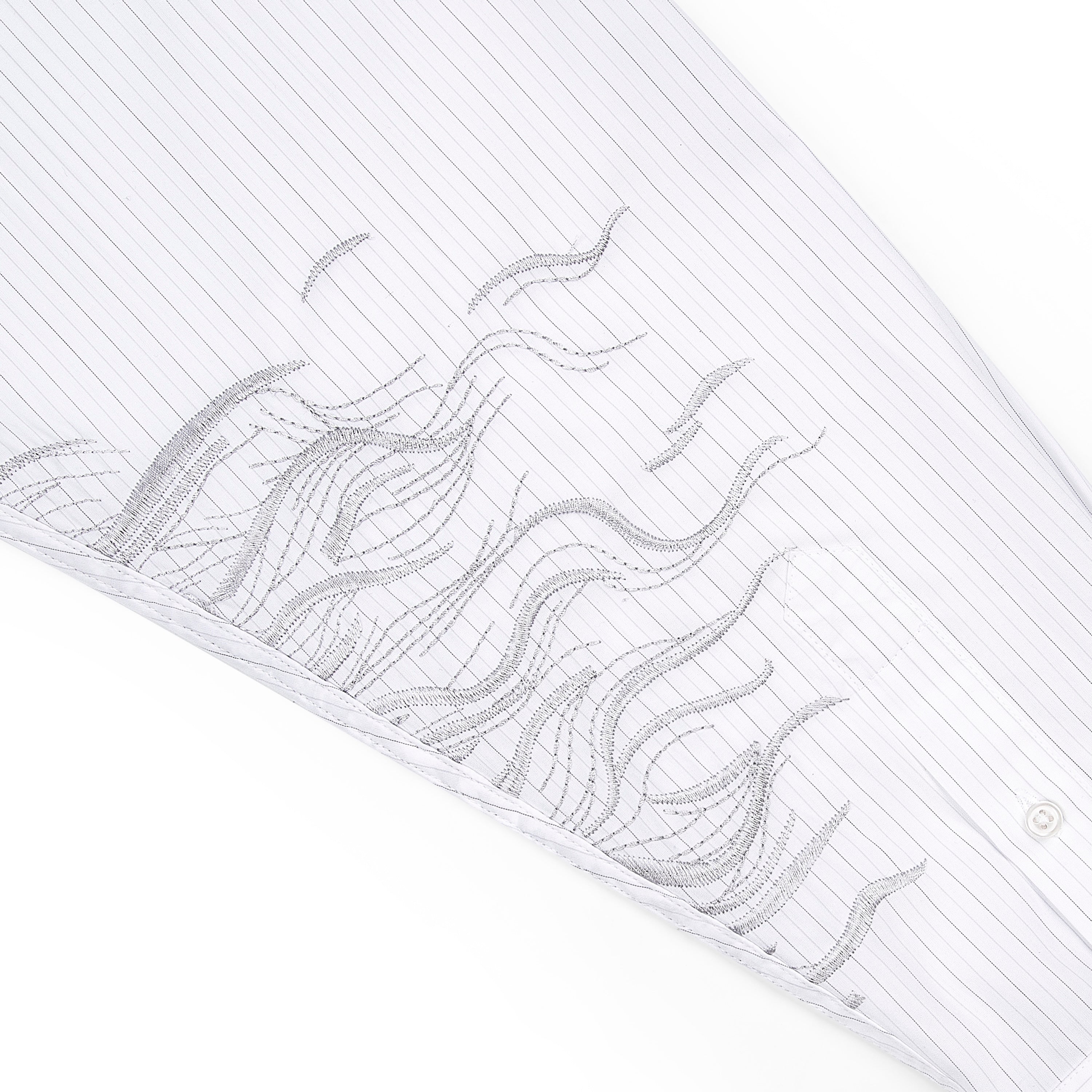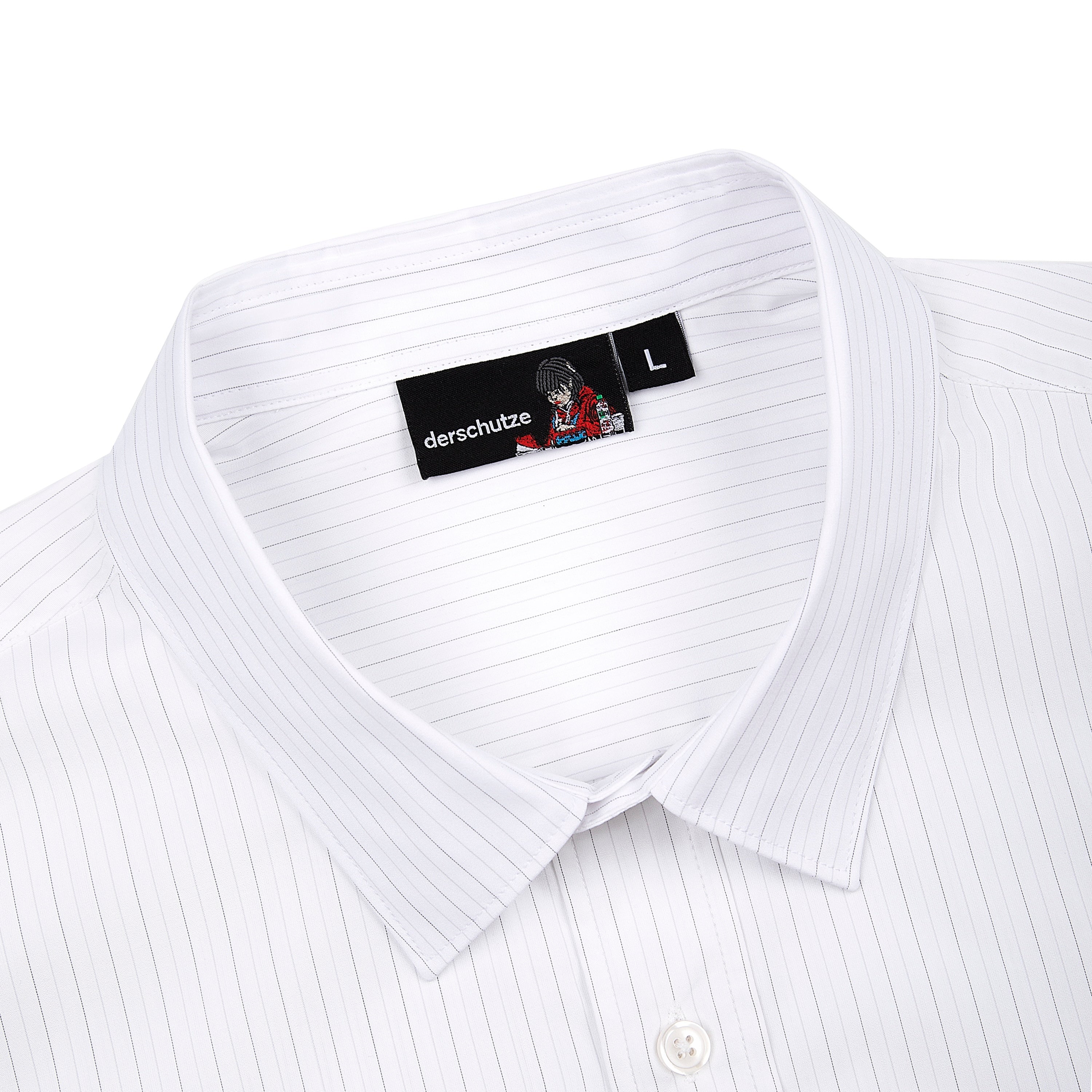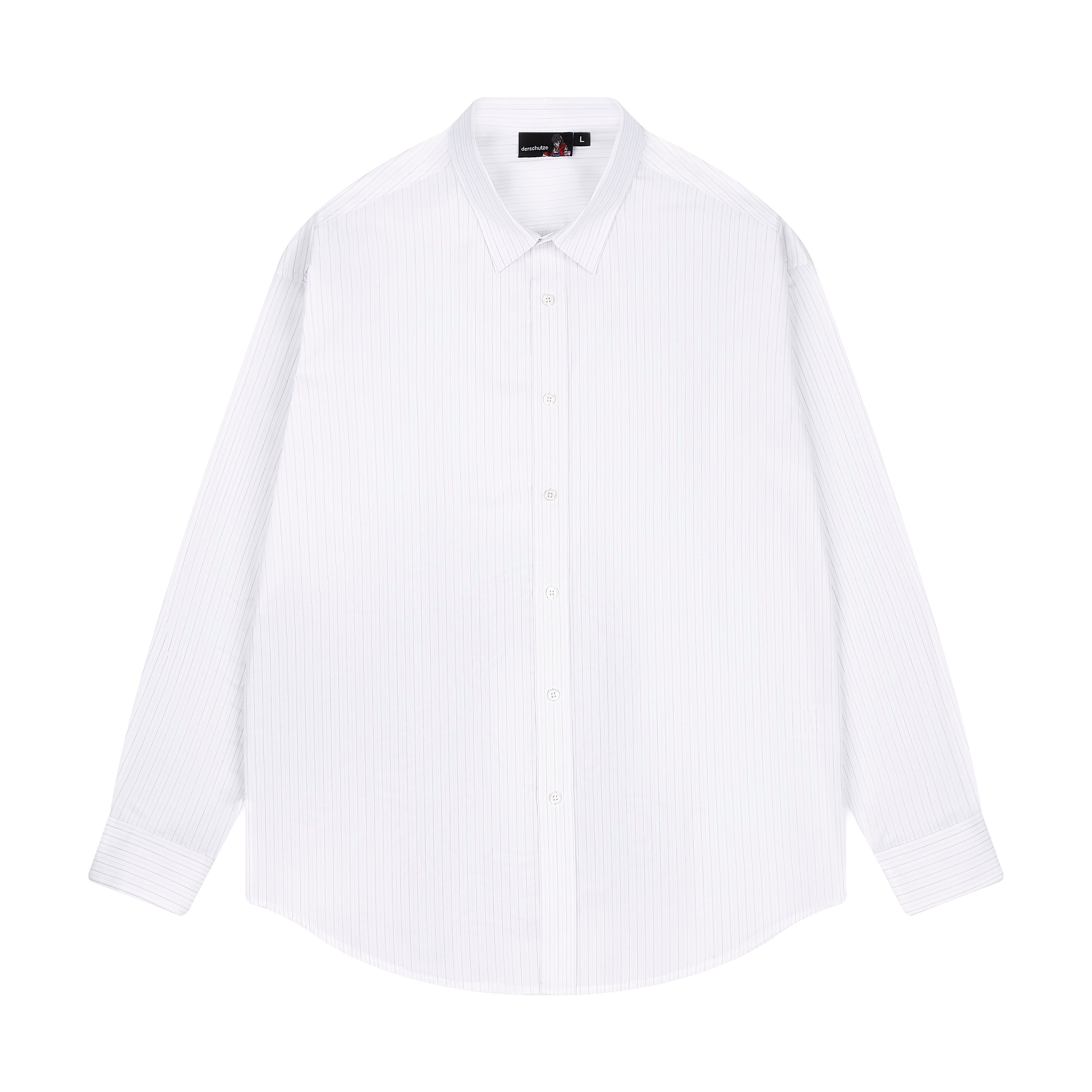 100% cotton / white-grey striped / embroidery on back and sleeve / customized 'derschutze' buttons on front, collar and cuffs / curved hem / relaxed fit / fits true to size