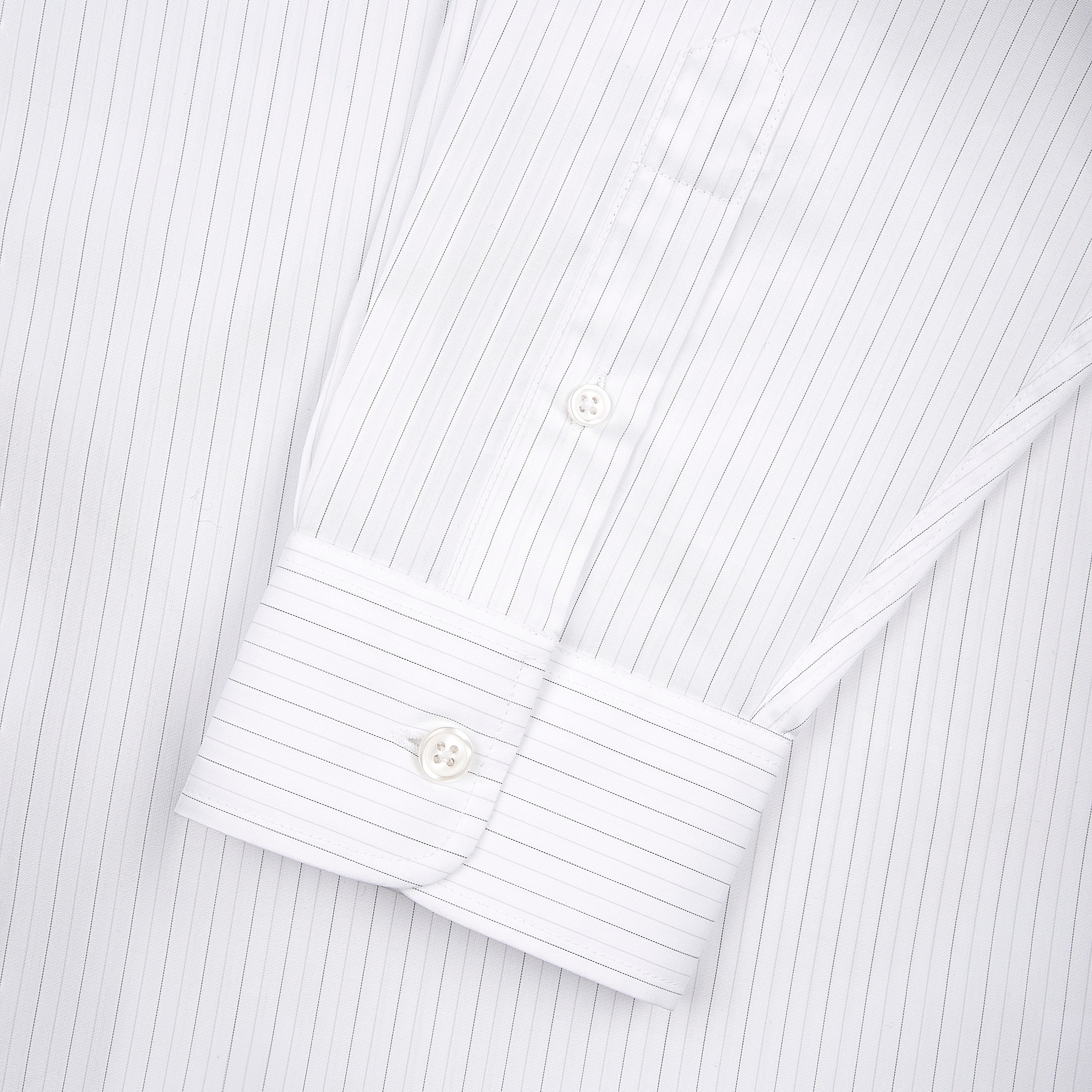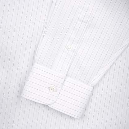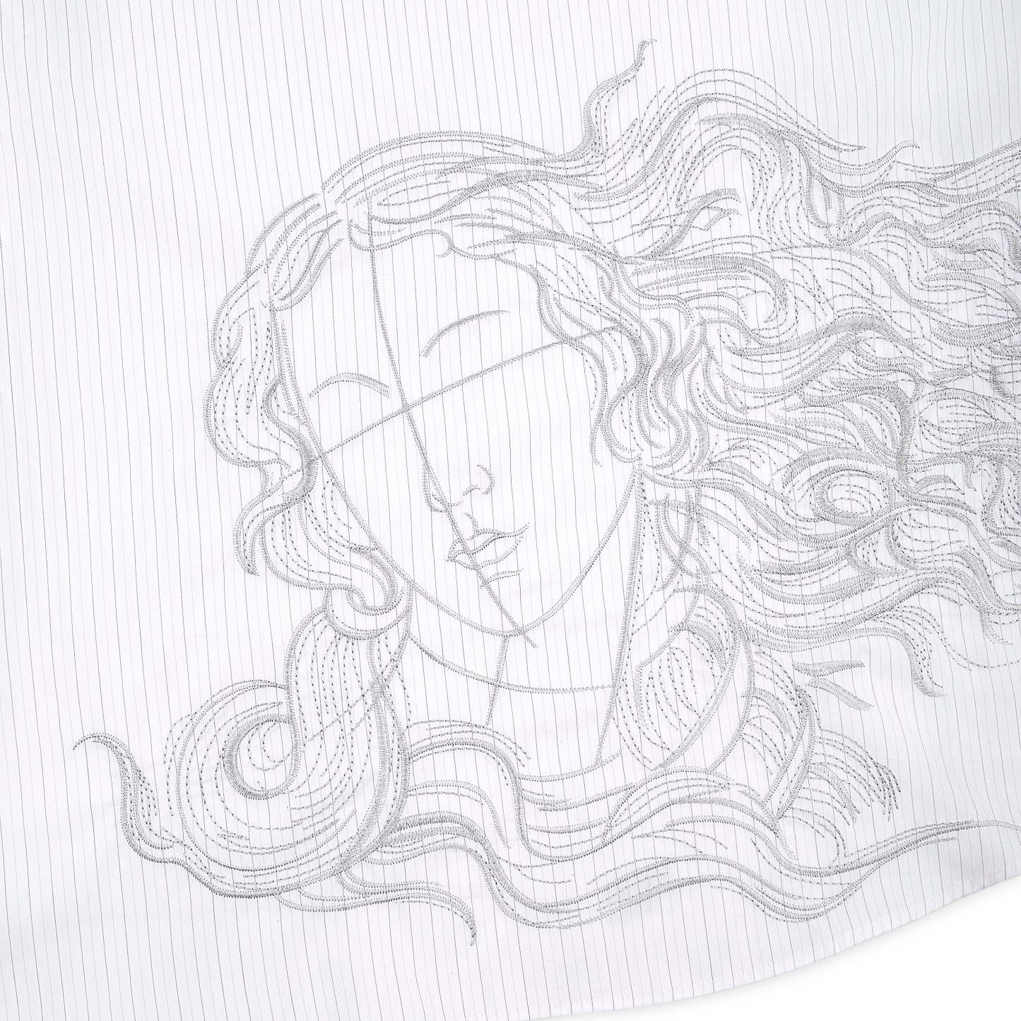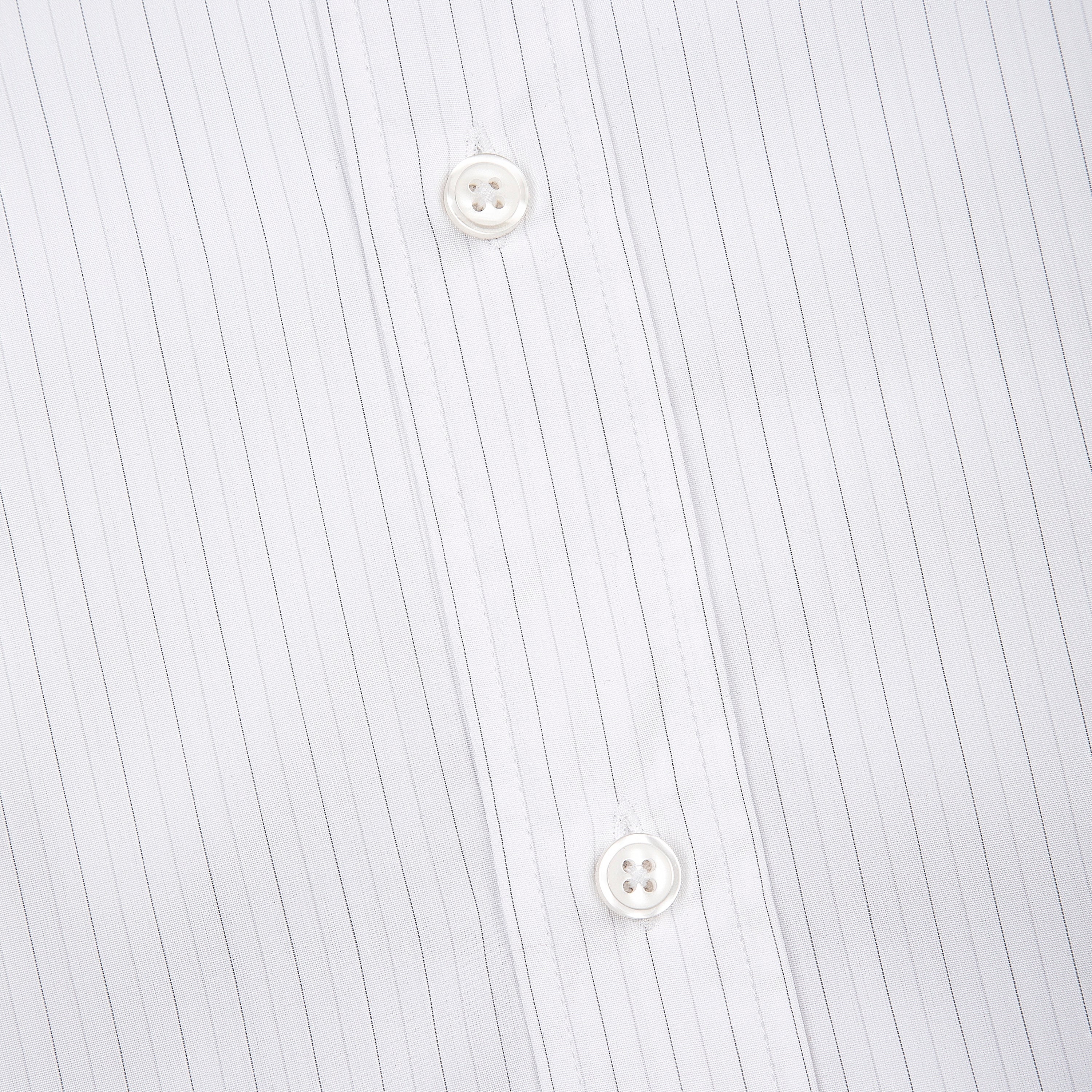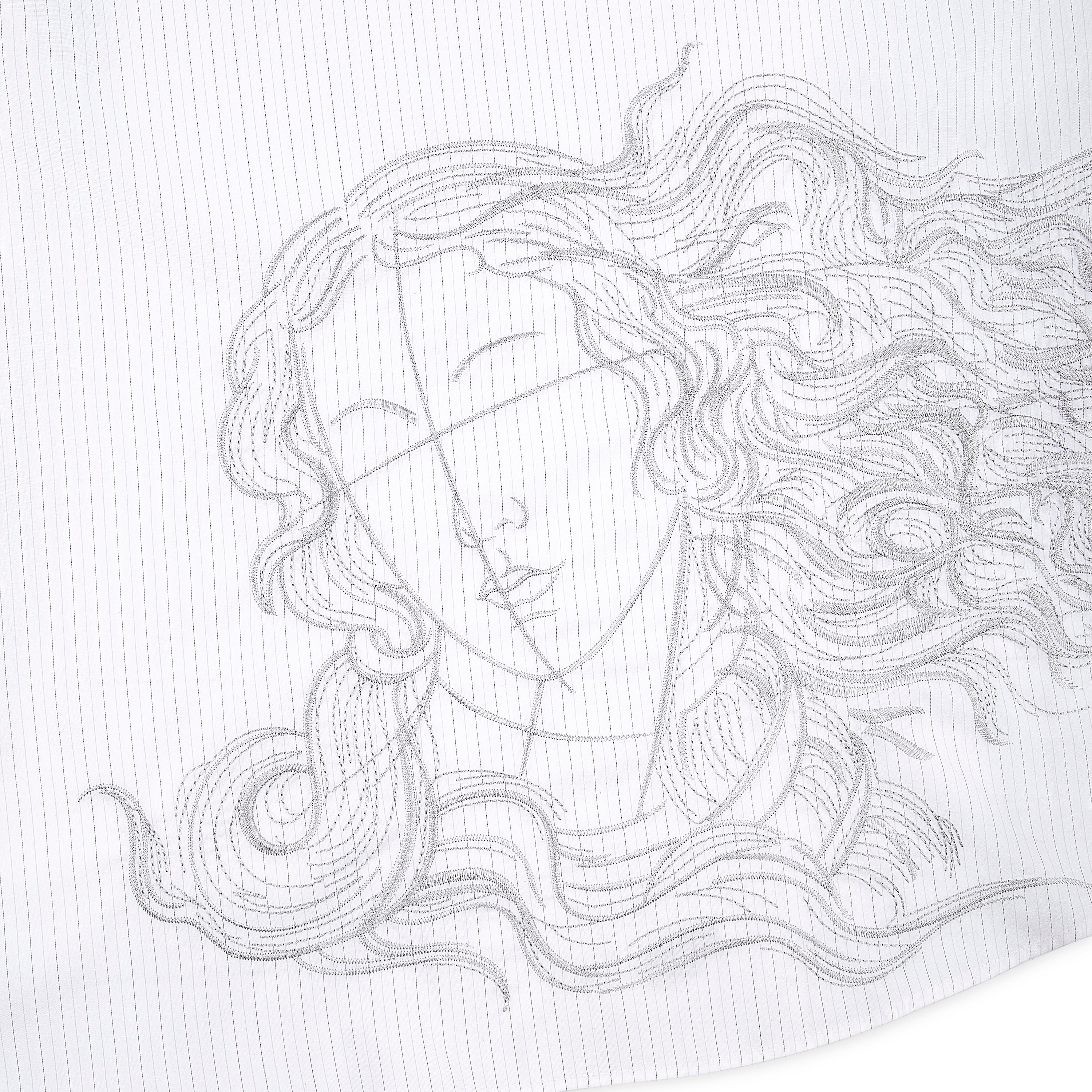 100% cotton / white-grey striped / embroidery on back and sleeve / customized 'derschutze' buttons on front, collar and cuffs / curved hem / relaxed fit / fits true to size
