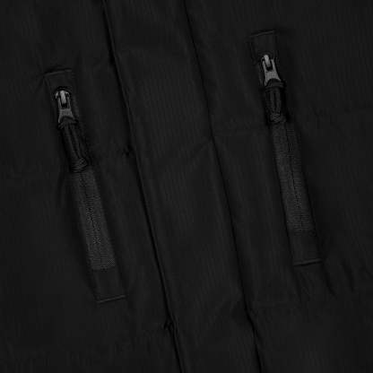 water repellent fabric / 100% polyester / micro gel filling / embroidery on sleeves, front and back / removable hood / adjustable waistband / fits true to size