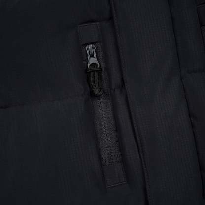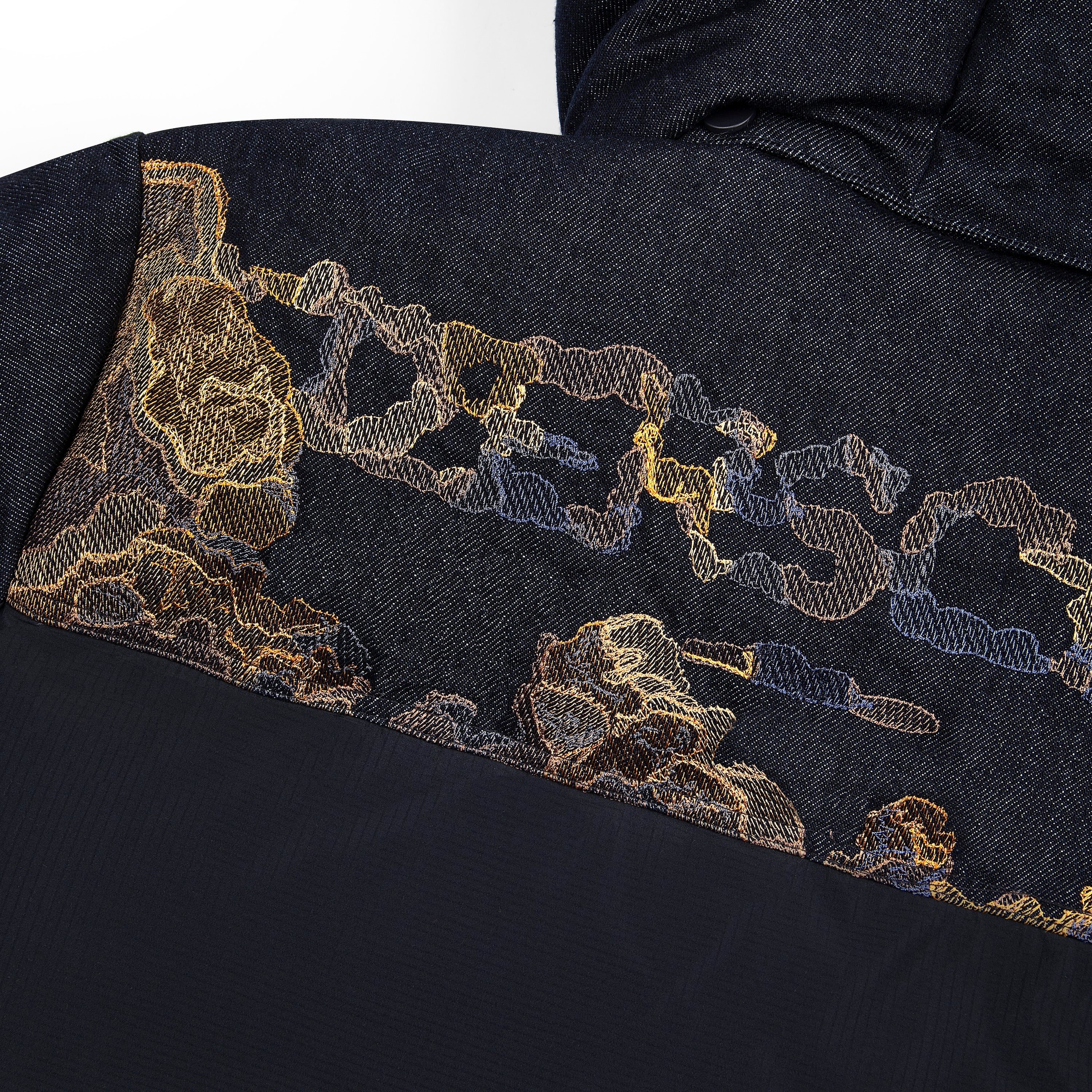 100% polyester water repellent fabric / 10oz denim / micro gel filling / embroidery on front-back yokes and sleeves / removable hood / adjustable waistband / fits true to size