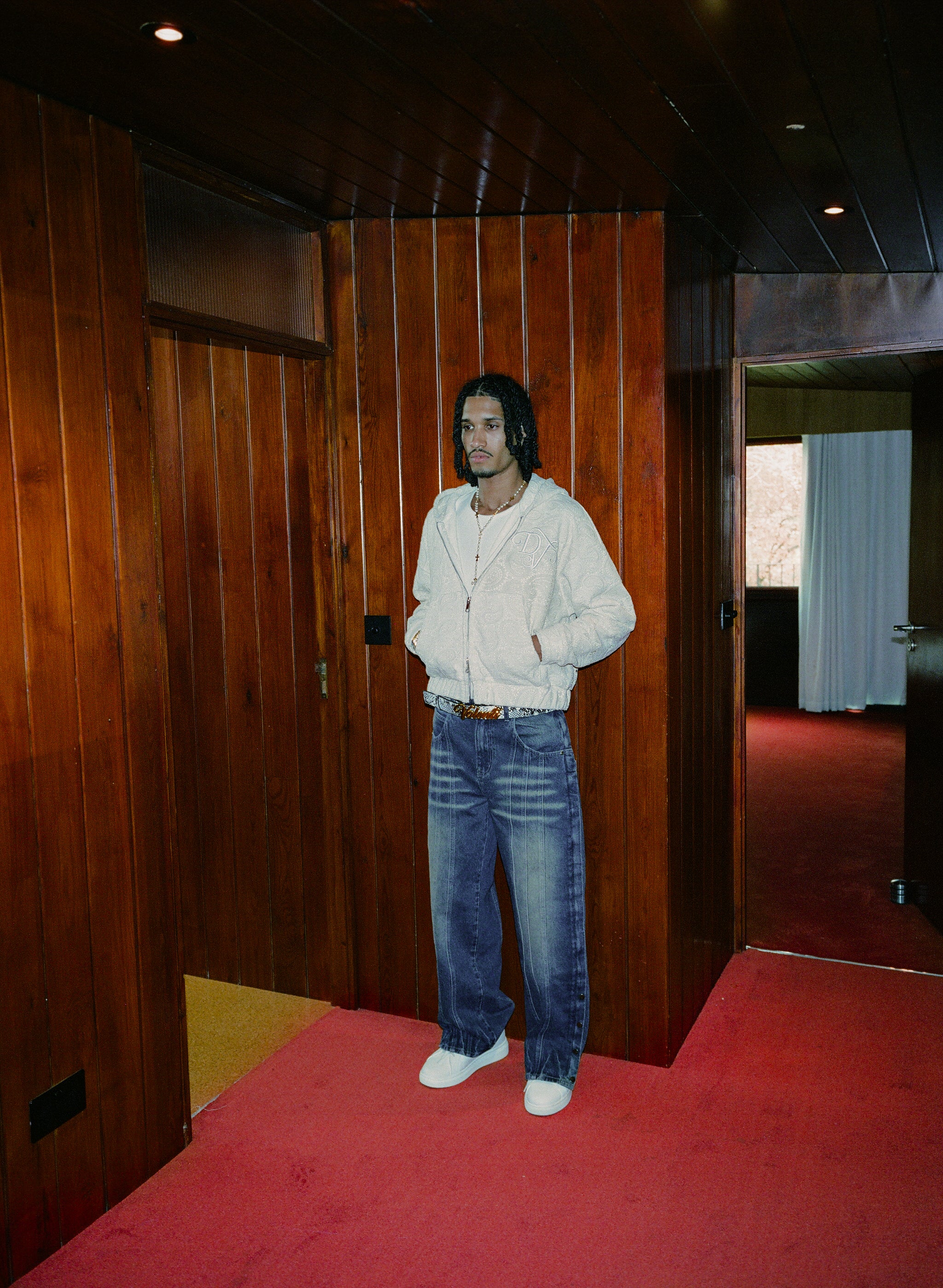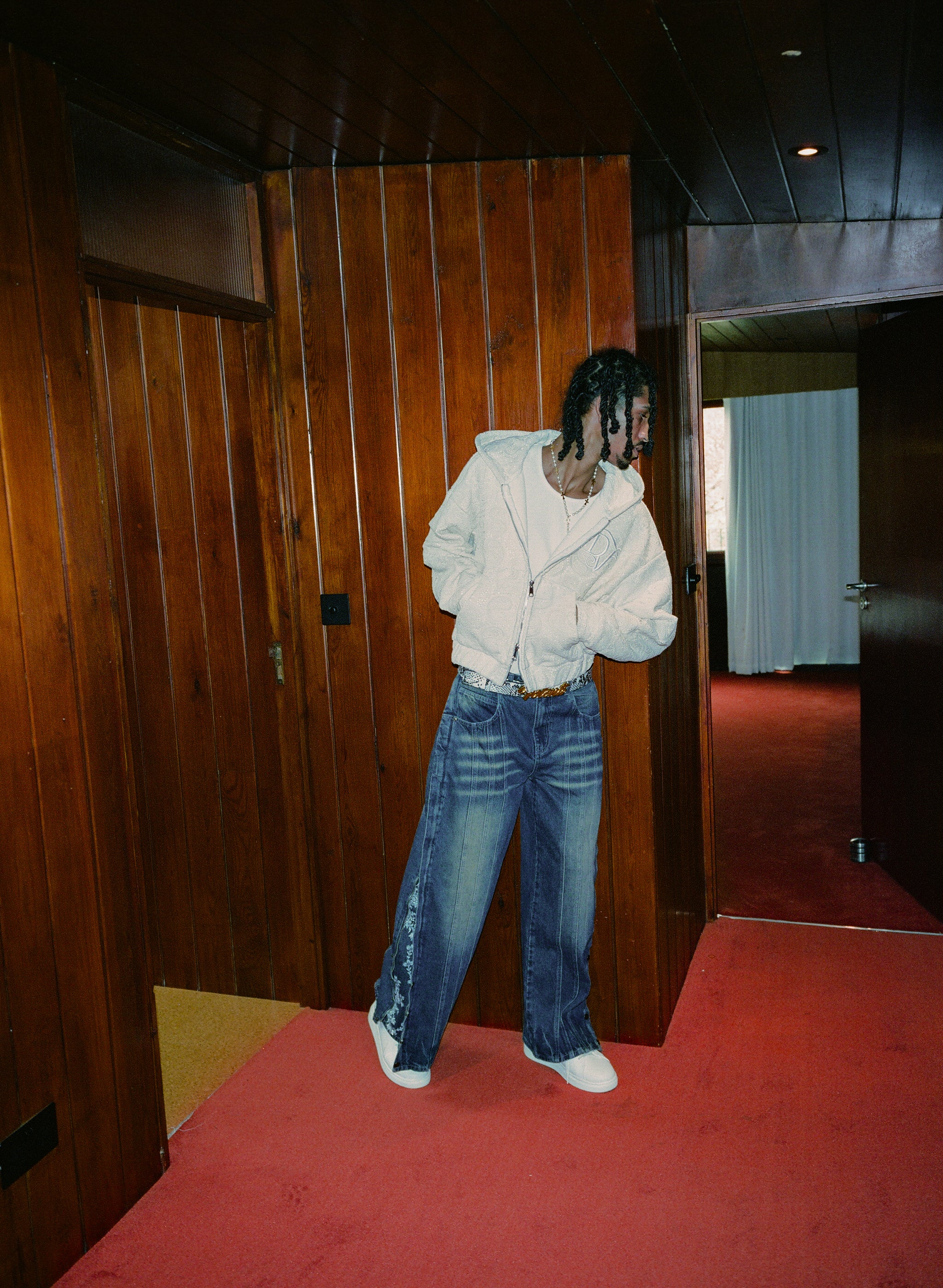 These jeans feature a hidden embroidered floral detail that can be revealed with a side zipper, along with front seam accents and metal stud detailing at the ankle.