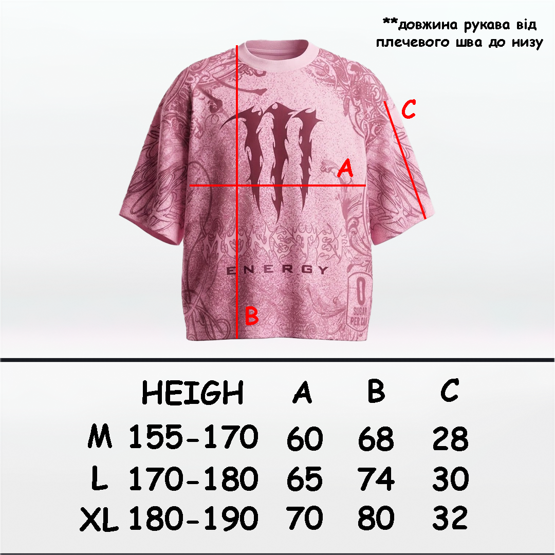material100% polyesterProduct availabilityIn stock"Monster" pink t-shirtSizes:M: 155170 cmL: 170180 cmXL: 180+ cmFeatures: Unique oversize fit modern relaxed cut Breathable fabric that keeps its shape and look even after many washesCool and drytechnology makes the garment soft, lightweight, and flexible Prints are applied using sublimation fused into the fabric, not felt to the touch and very durable Perfect for summer comfortable even in hot weather📦 Each item is packed in a zip bag, stickers included as a gift
