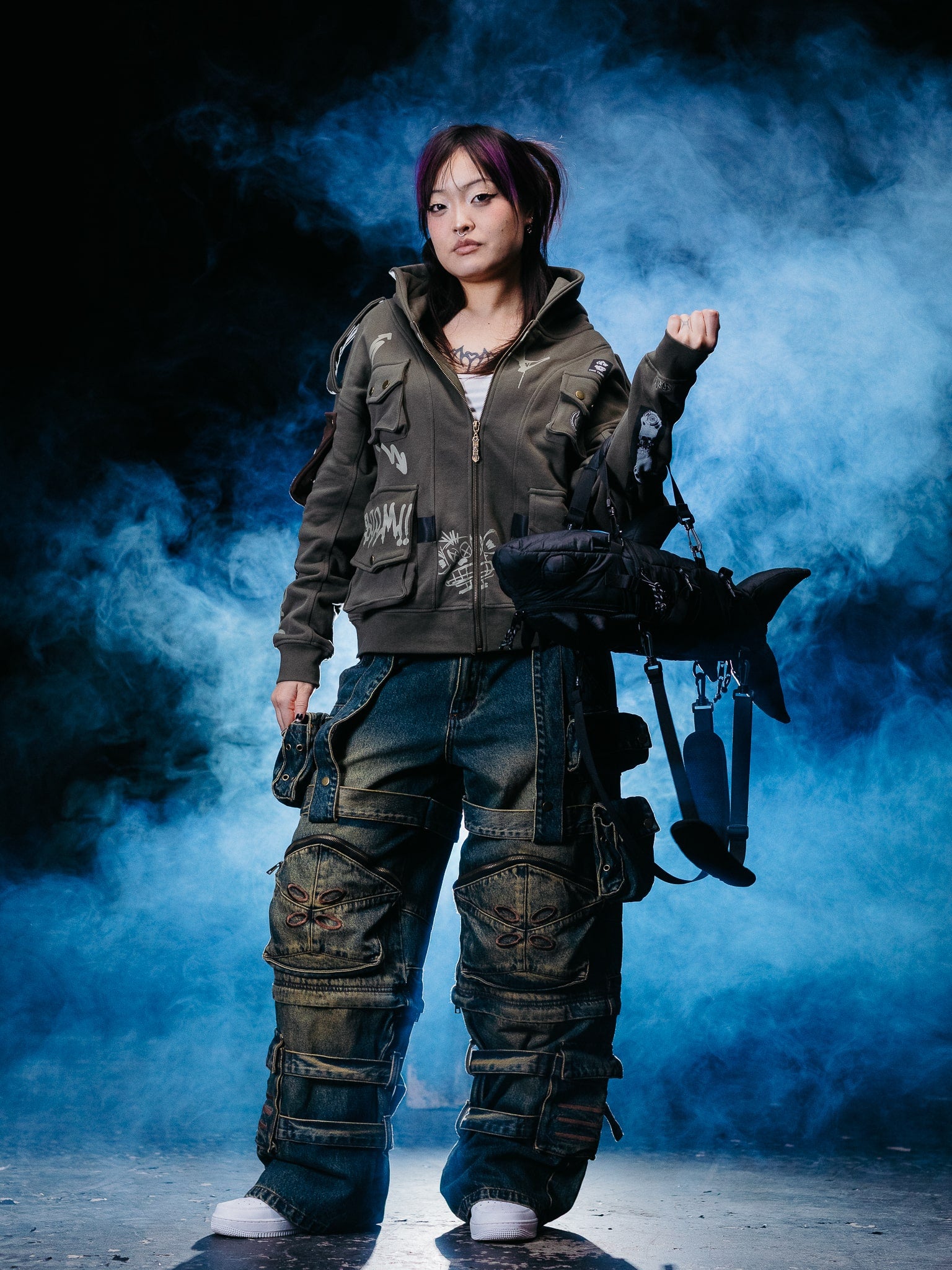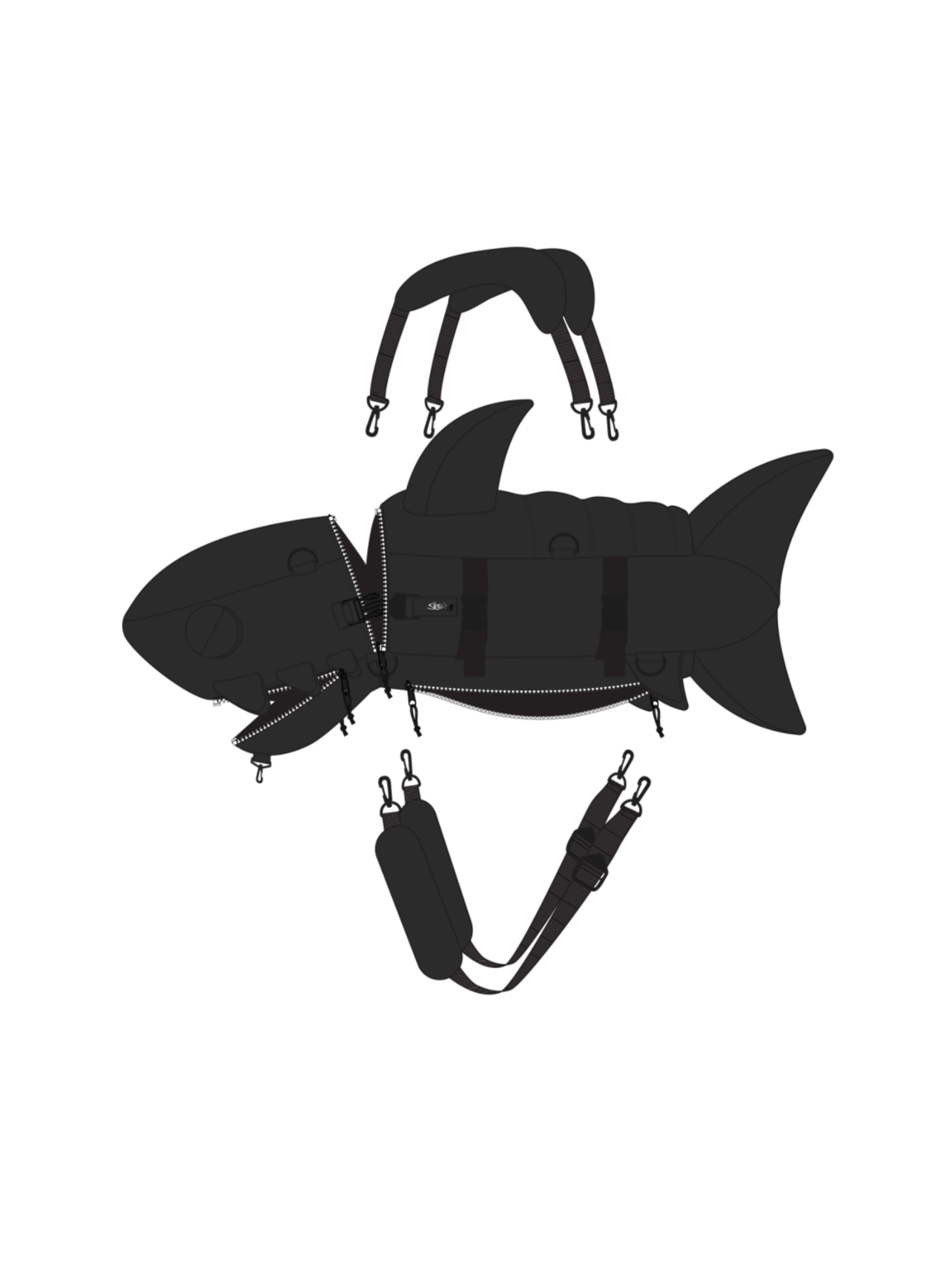 You can wear it in two ways: as a backpack or a regular bag with detachable straps. It has one big pocket that takes up the entire space inside the shark, and a small pocket on the bottom where you can store the removed strap set or small belongings like a phone.