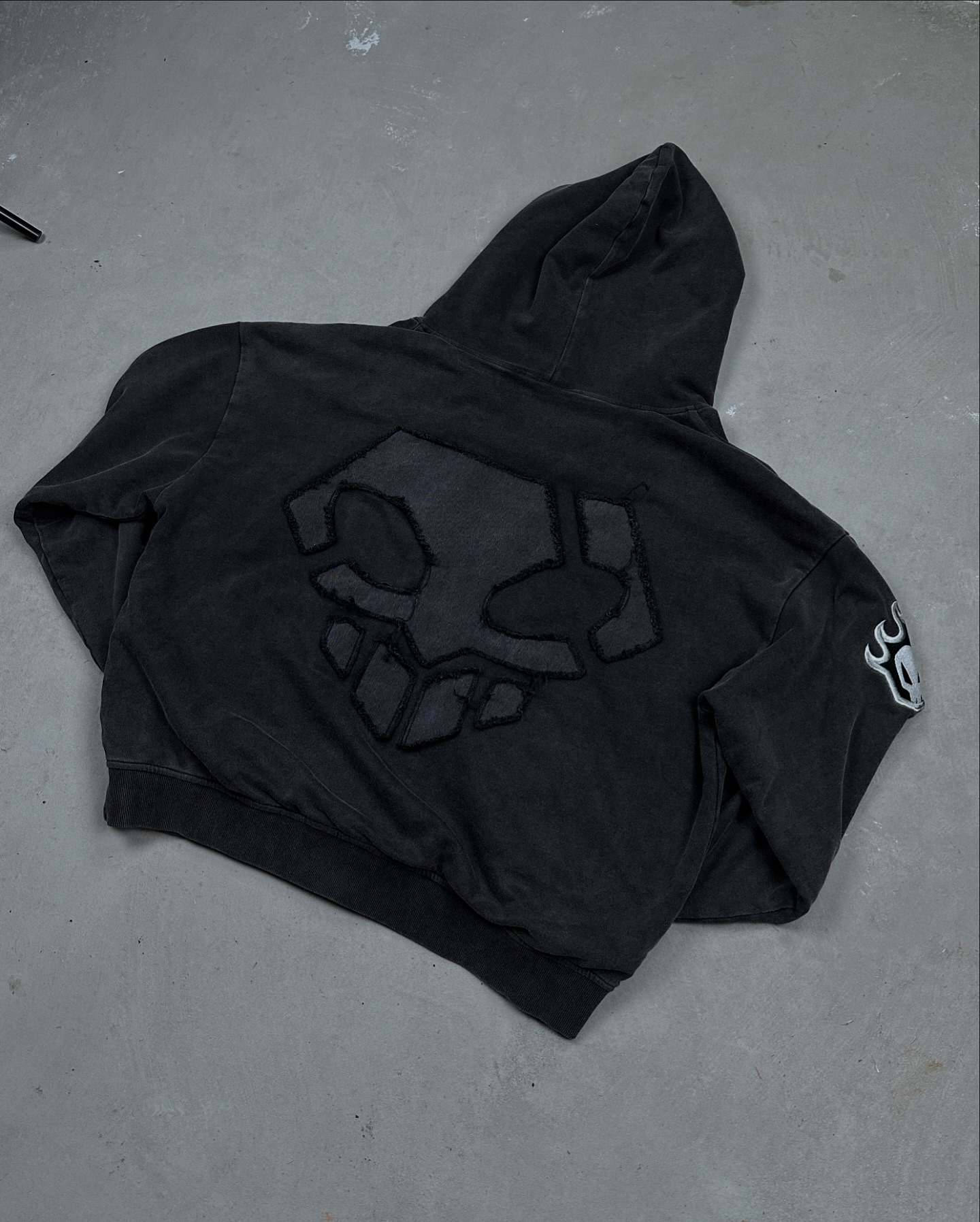 Large flocked embroidery of reaper skull on back