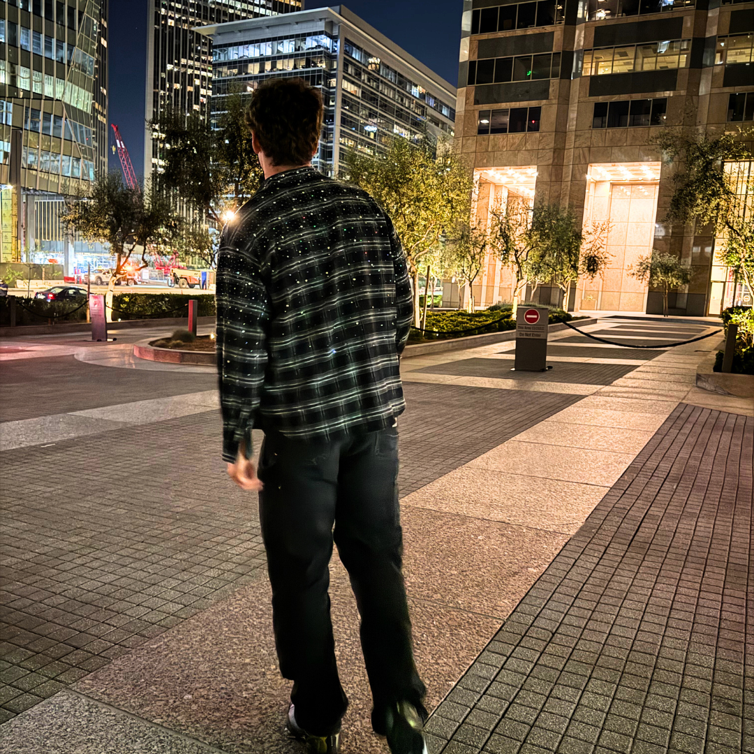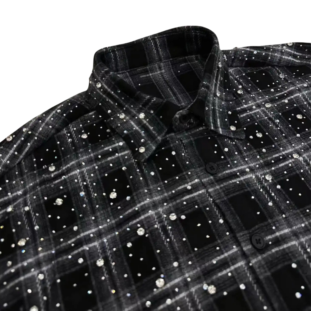 Elevate your wardrobe with the Rhinestone Galaxy Plaid Shirt, a bold statement piece that fuses streetwear aesthetics with celestial-inspired elegance.